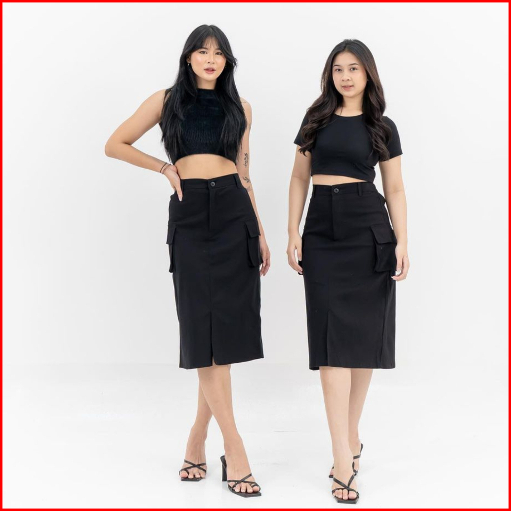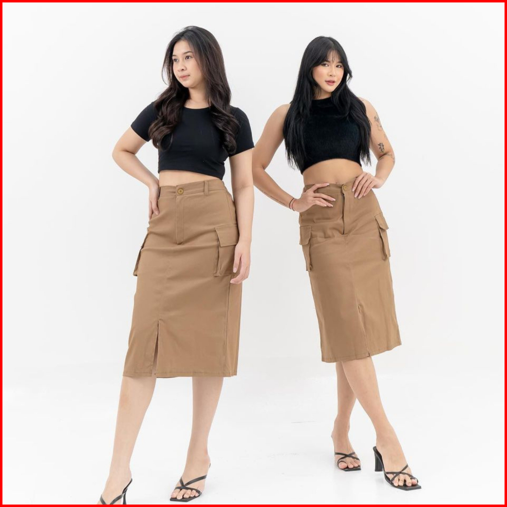 Rok Cargo Midi 7 8 Katun Skirt Midi Kargo High Waist Belah Karet Pinggang Wanita Dewasa Panjang