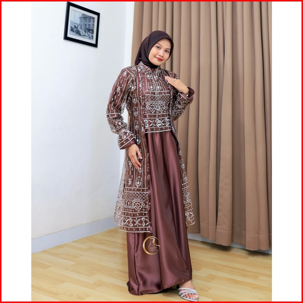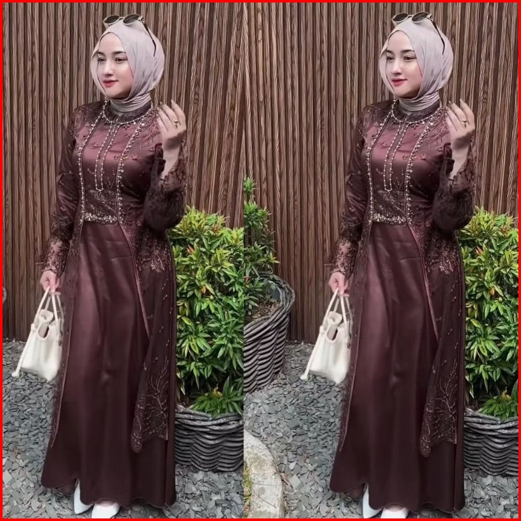 Tiara Dress Silk Burgandy Set Outer Brokat Payet Mutiara Baju Gamis Pesta Kondangan Wanita Kekinian