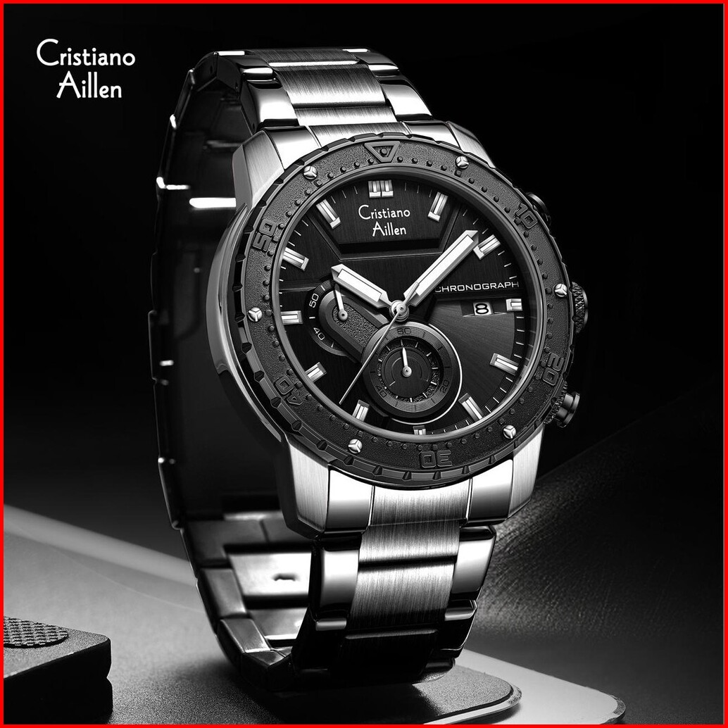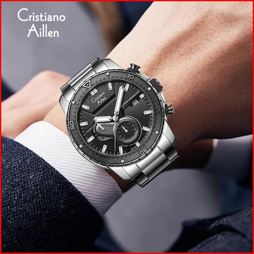 Cristiano Aillen Jam Tangan Pria Analog 8900 Rantai Stainless Steel Chronograph Kaca Sapphire Water Resistant 3 Atm