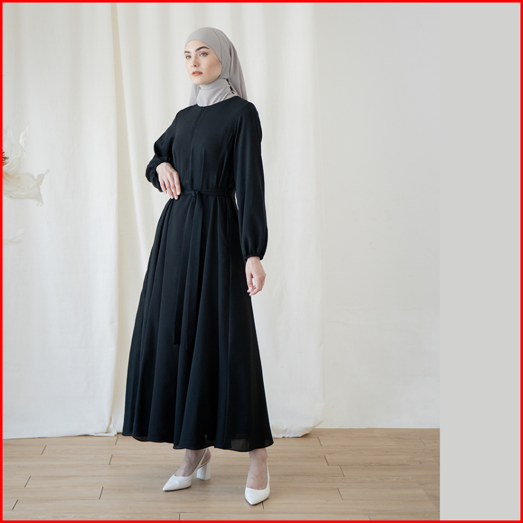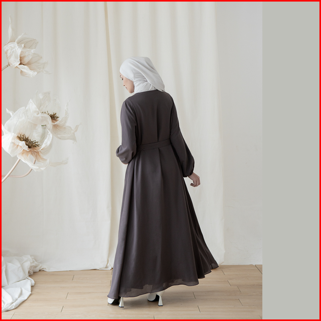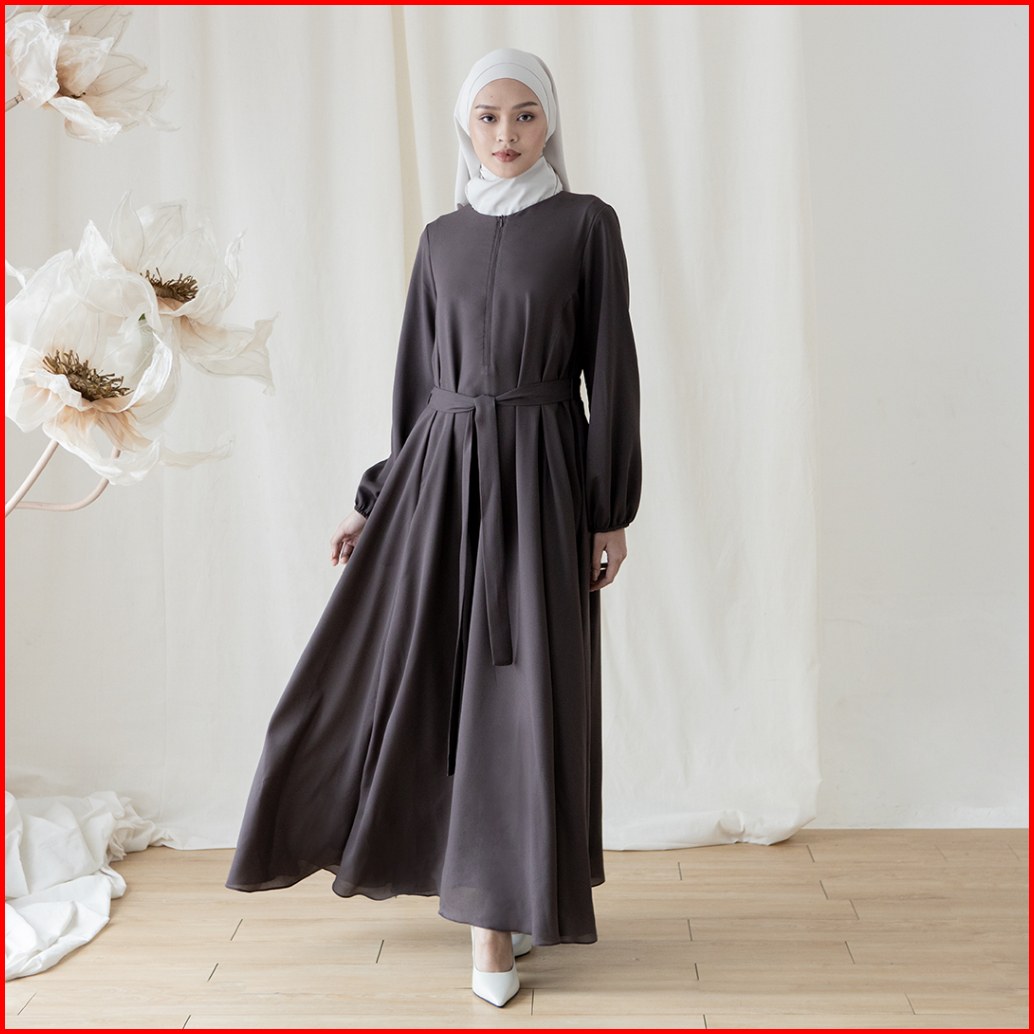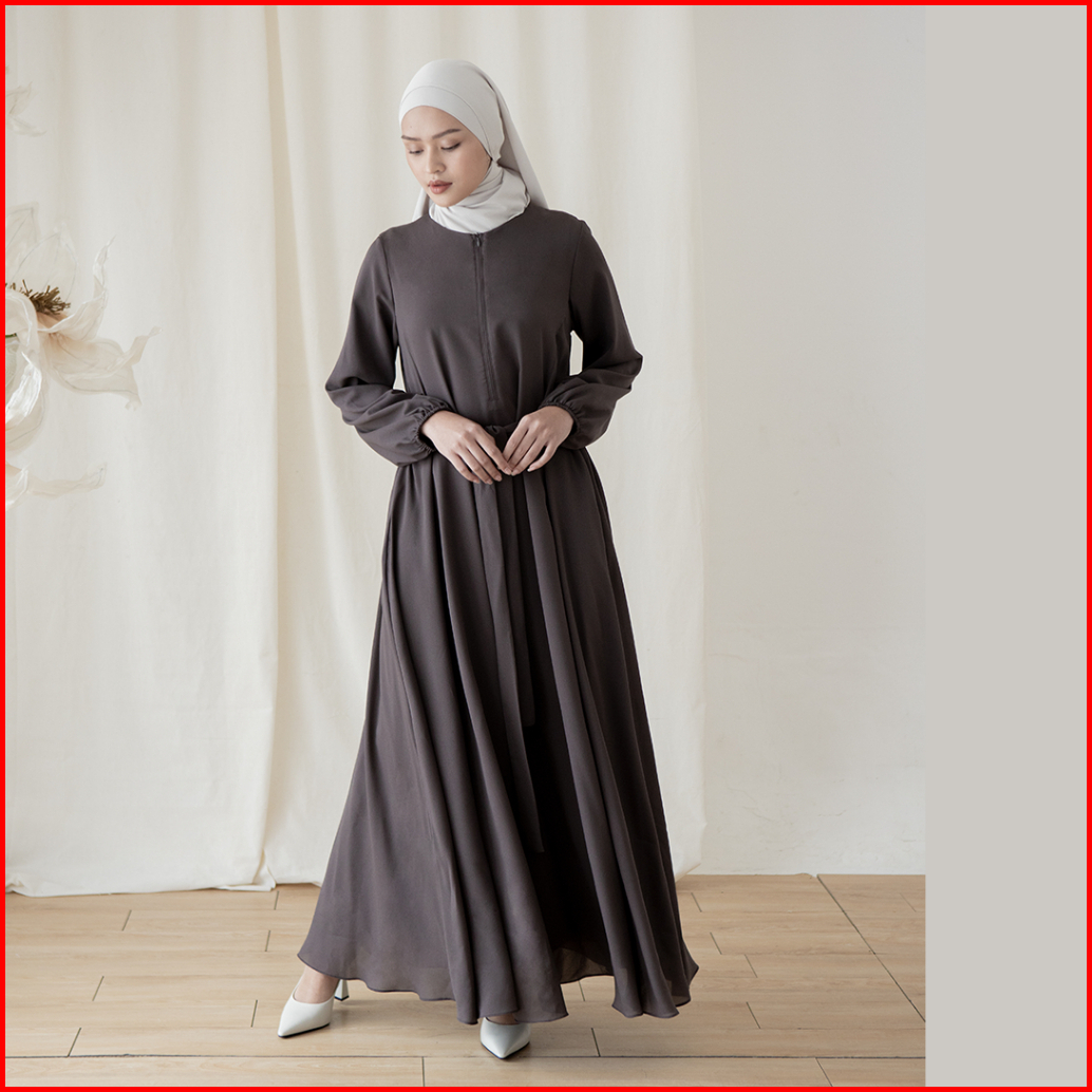 Hapsara By Aska Label - Gamis Wanita Dress Wanita 2 Layer Dengan Ikat Pinggang Dan Busui Friendly Warna Putih Abu Tua Da