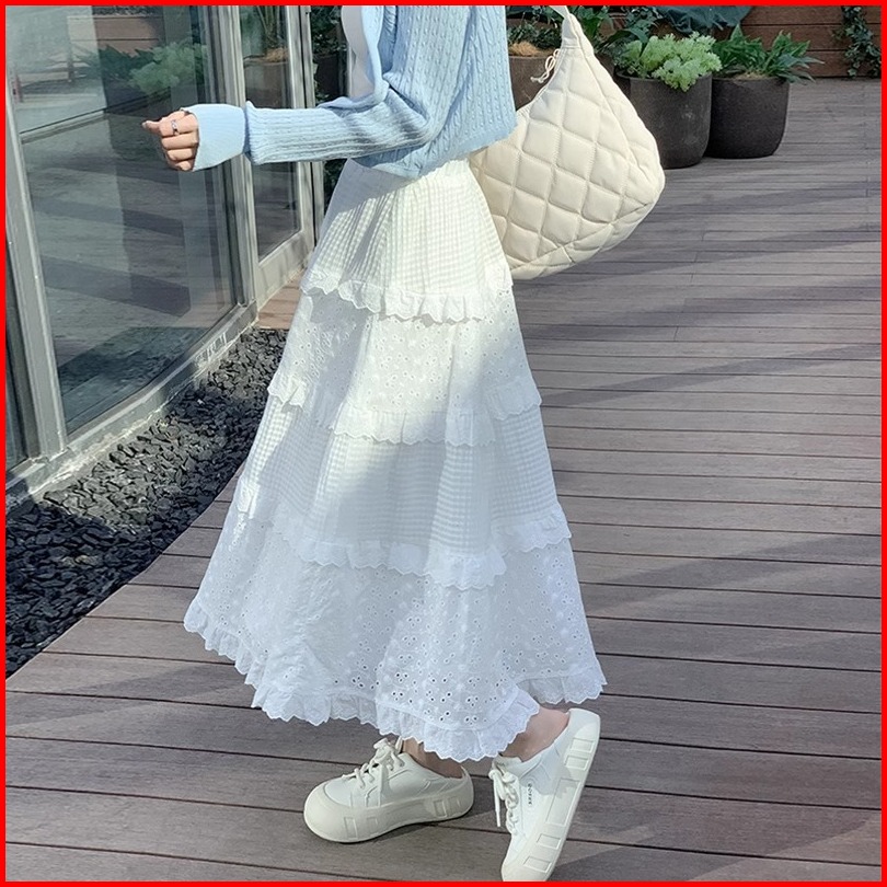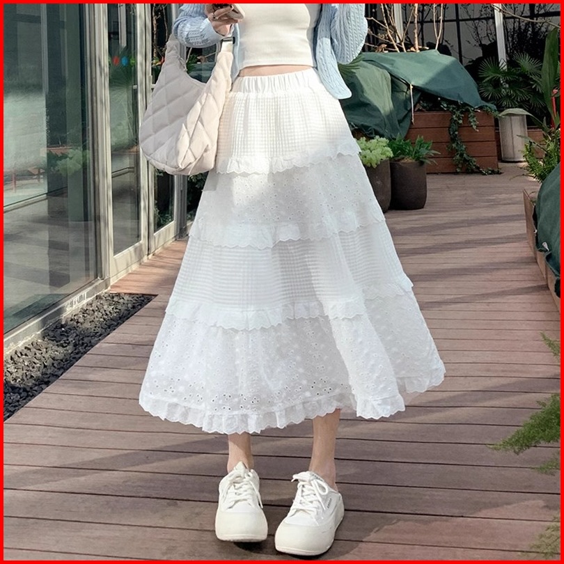 Y6y - Versi Korea Dari Rok Panjang A-line Kasual Pinggang Elastis Kualitas Tinggi Impor Baru Rok Renda Putih Anti Ekspos