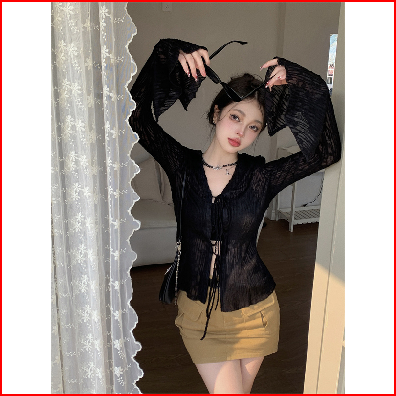 Korean V Neck Long Sleeve Drawstring Tulle Cardigan 2231