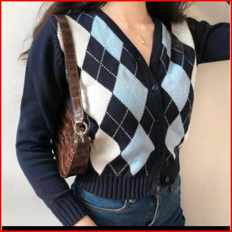 V Neck Ketupat Cardy Kardigan Rajut Premium