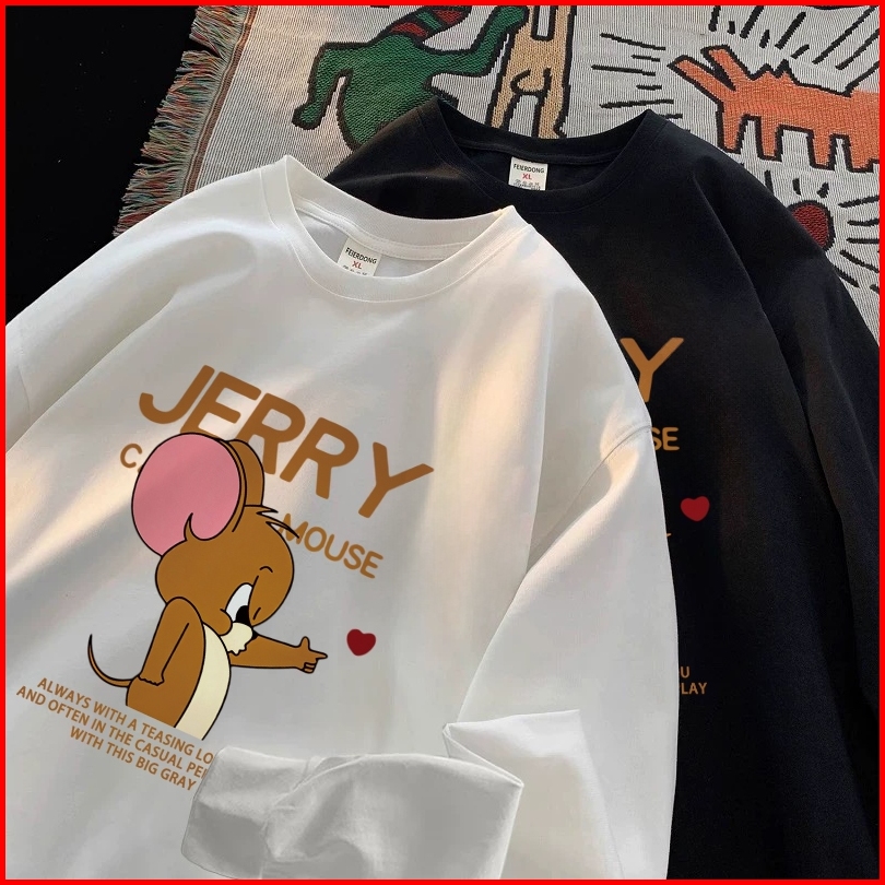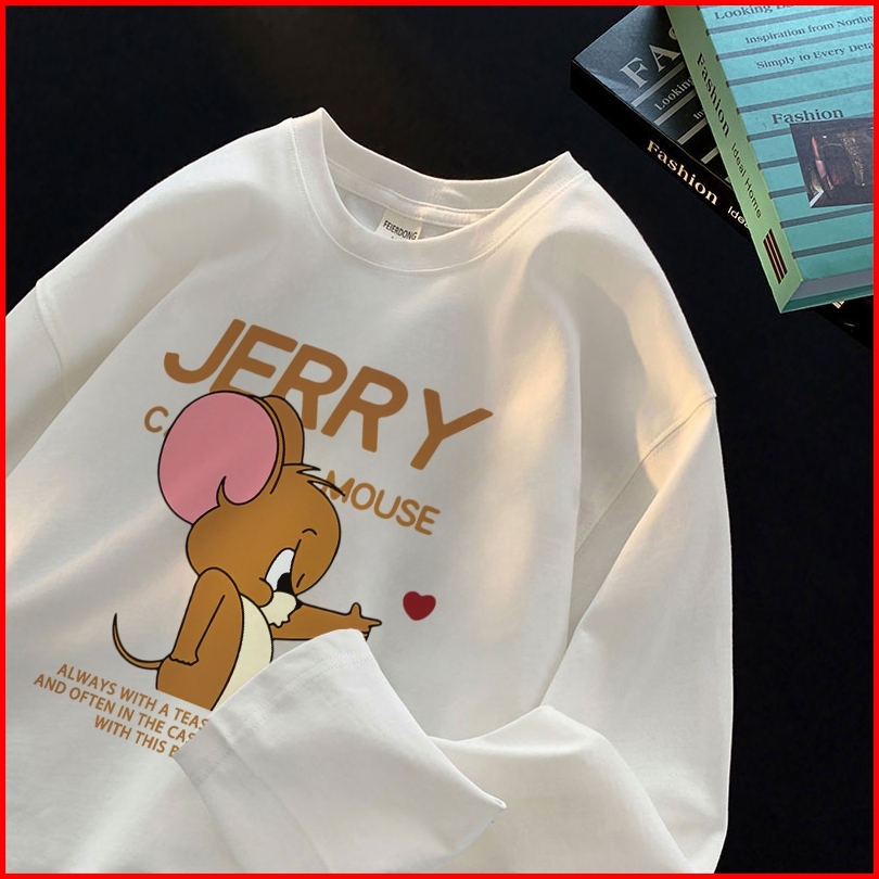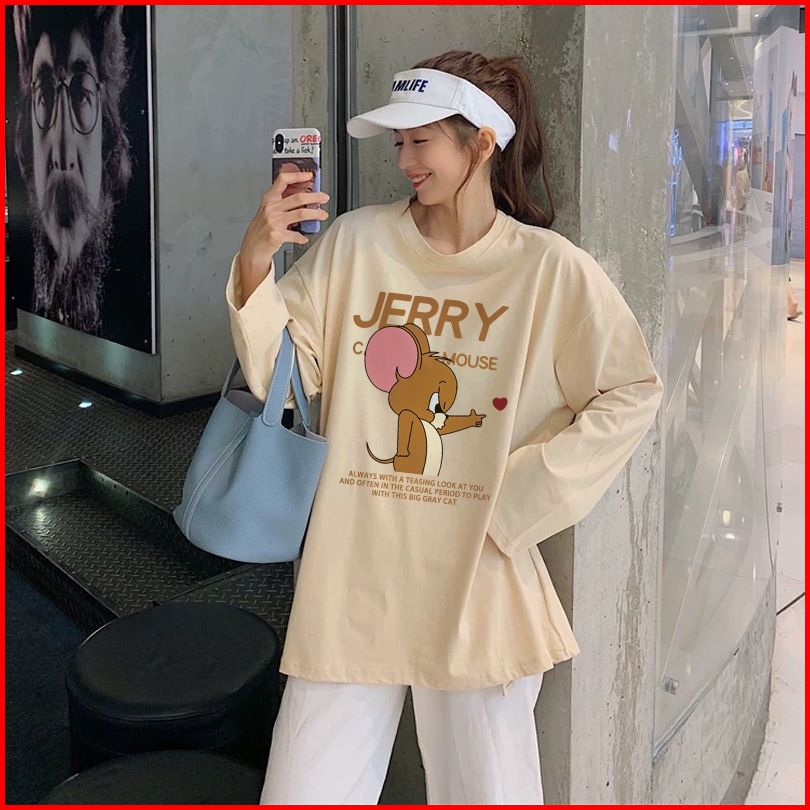 Forteid Atasan Kaos Wanita Oversize Lengan Panjang Korean Style Cetakan Kartun Baju Kaos Polos Cotton Combed Premi