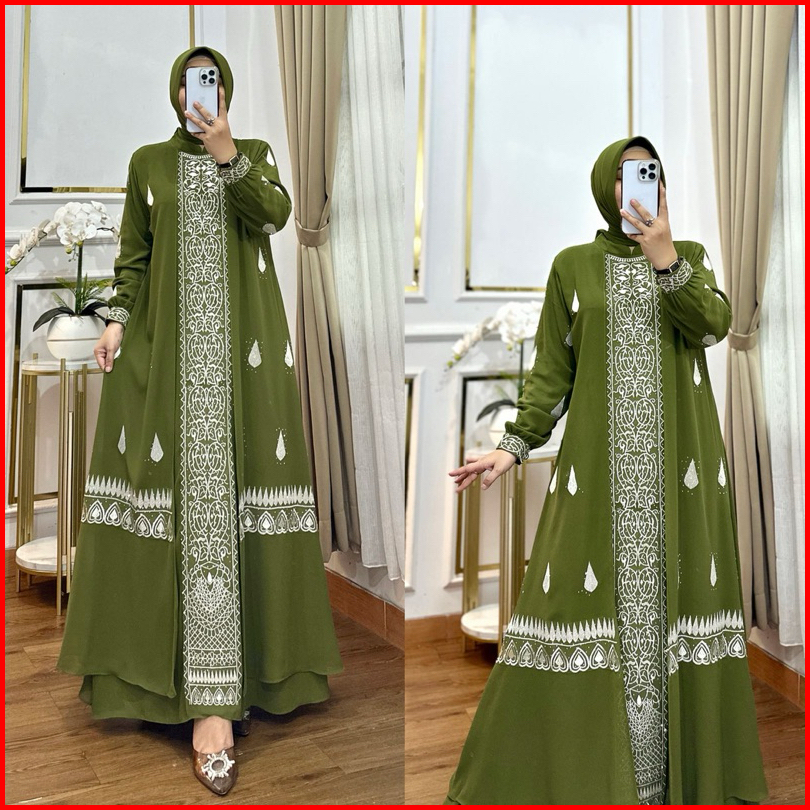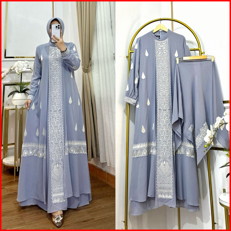 Gamis Bordir Dua Layer Set Hijab Terbaru Mewah Simple Elegan Matt Ceruty Babydoll Premium