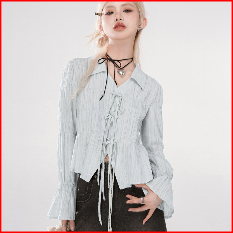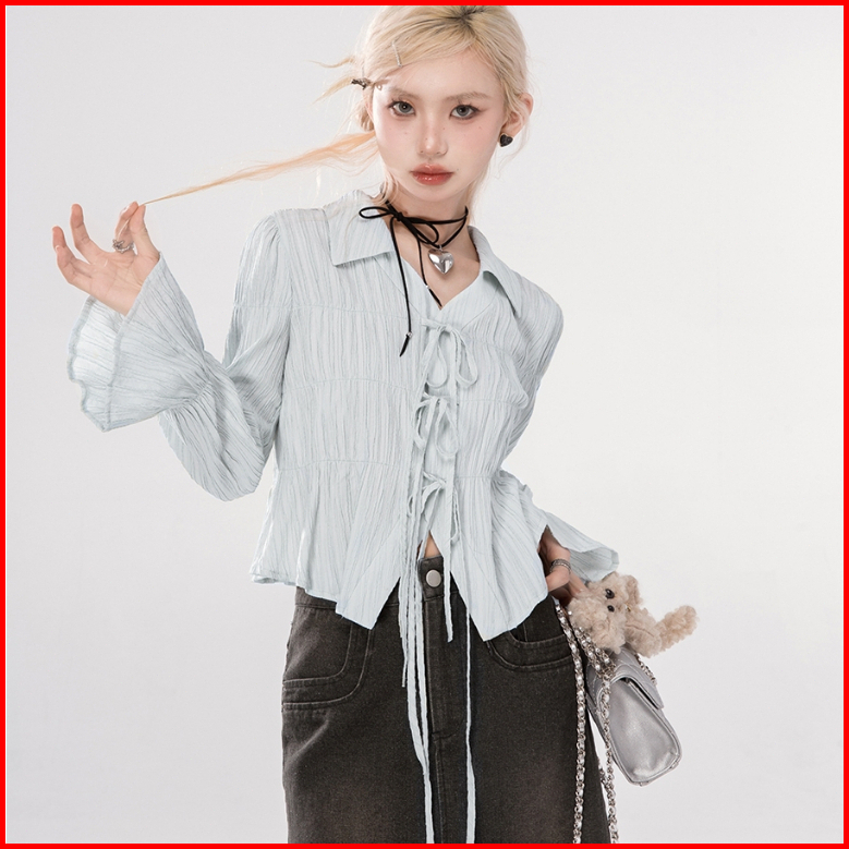 Yiyi Girl V-neck Blouse Wanita Lengan Panjang Renda Kemeja Korea Blouse Wanita Korea