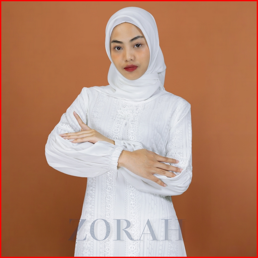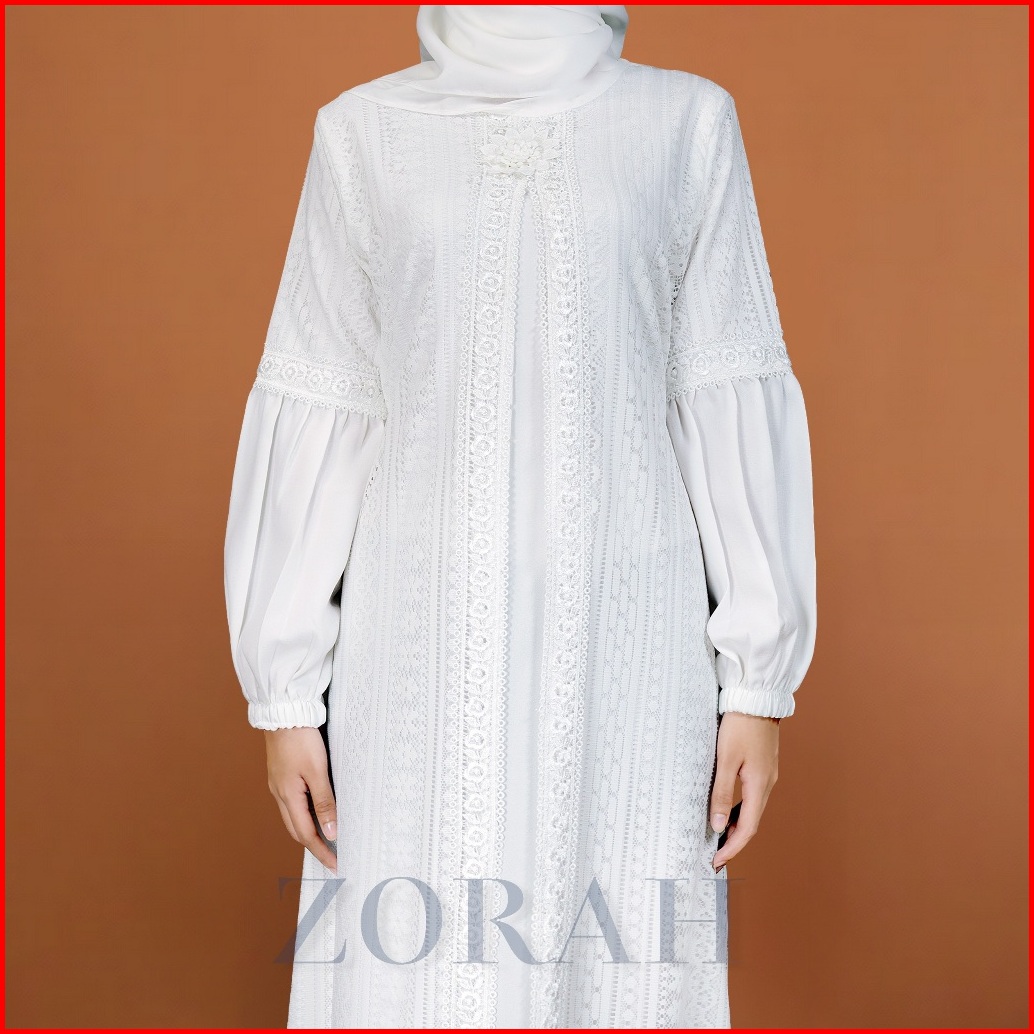 Zorah Gamis Brukat Putih Wanita Mewah Dan Elegan Terbaru Dress Brokat Bunga Putih Simple Fashionable Kekinian Wudhu Frie