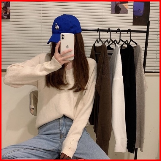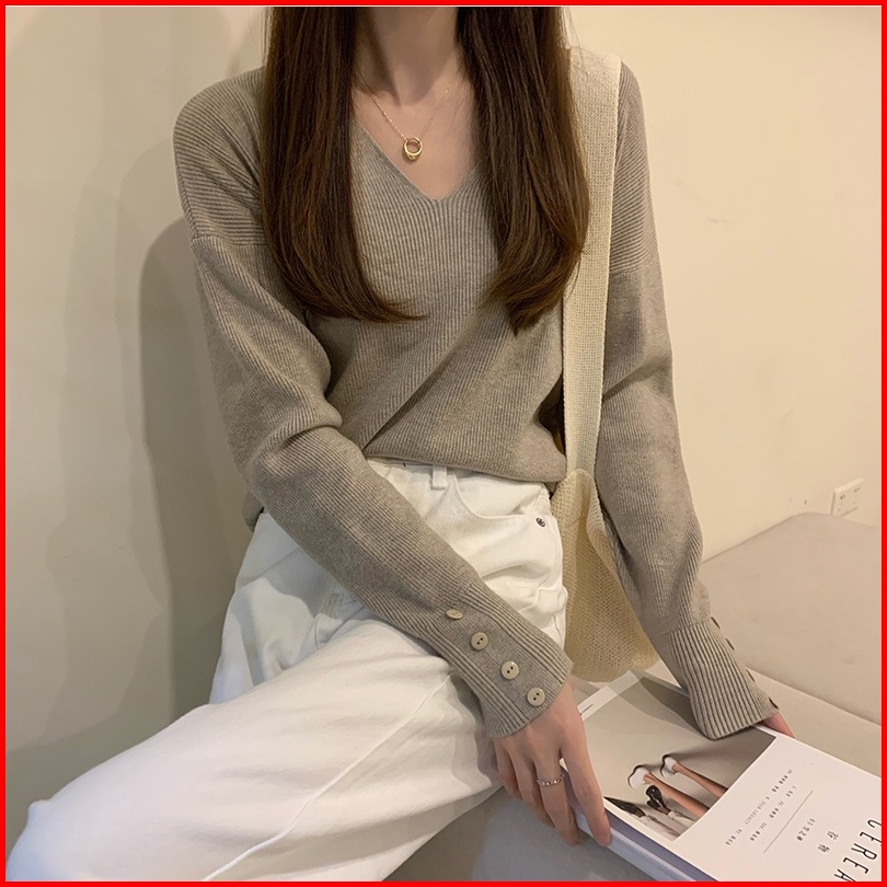 Yikoo-sweater Rajut Lengan Panjang Warna Solid Korea V-neck Atasan Wanita