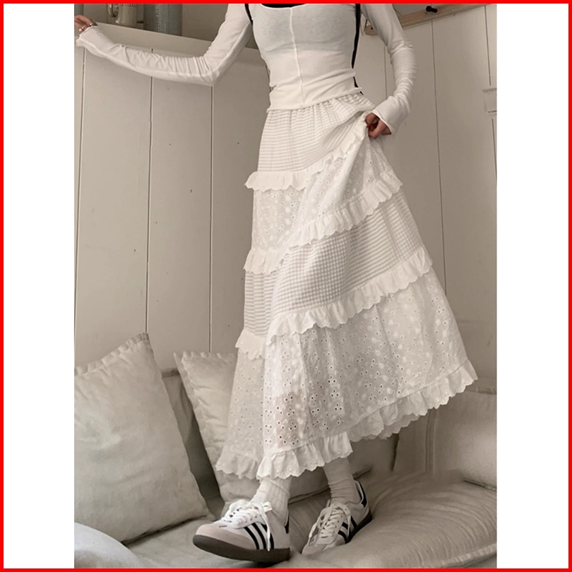 Rok Putih Renda Pinggang Tinggi Kualitas Tinggi Impor Baru Korea Selatan Gaun Prom Rok Kue Skirt A-line Longgar Wanita