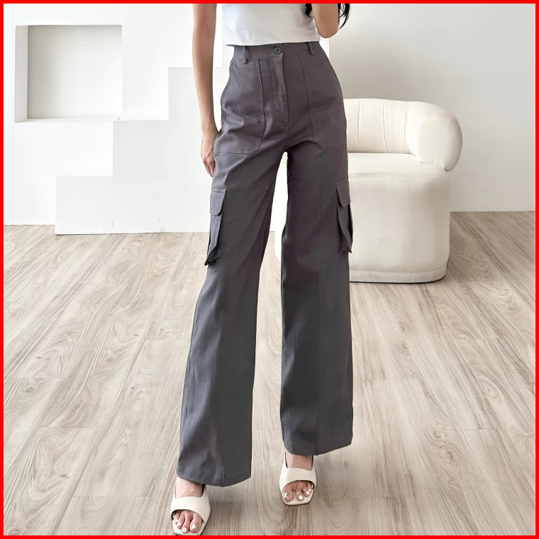 Rora Cargo Pants - Celana Cargo Wanita Katun Twill Stretch Highwaist Loose Korean Jumbo
