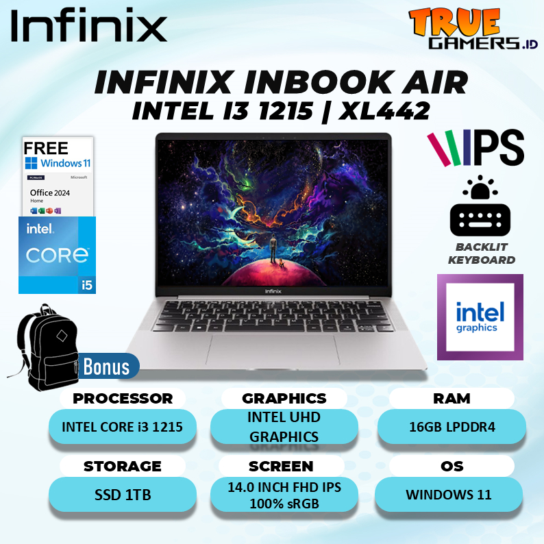 Laptop INFINIX INBOOK AIR Core i3 1215 RAM 16GB SSD 1TB Windows 11 + Office 14.0 Inch Wuxga IPS Panel 100 PERSEN sRGB