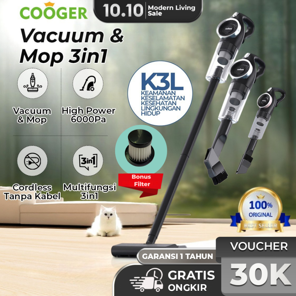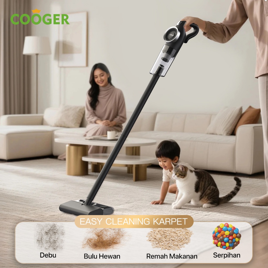 COOGER Vacuum Mop Lantai Serbaguna Vacuum Wet And Dry 3in1 Vacuum Tungau Cordless Tanpa Kabel Daya Hisap Kuat 6000Pa