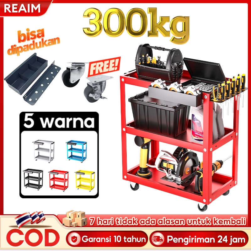 REAIM troli bengkel rak 3 susun troli barang trolley anti karat 300kg penyimpanan barang multifungsi lapisan anti selip
