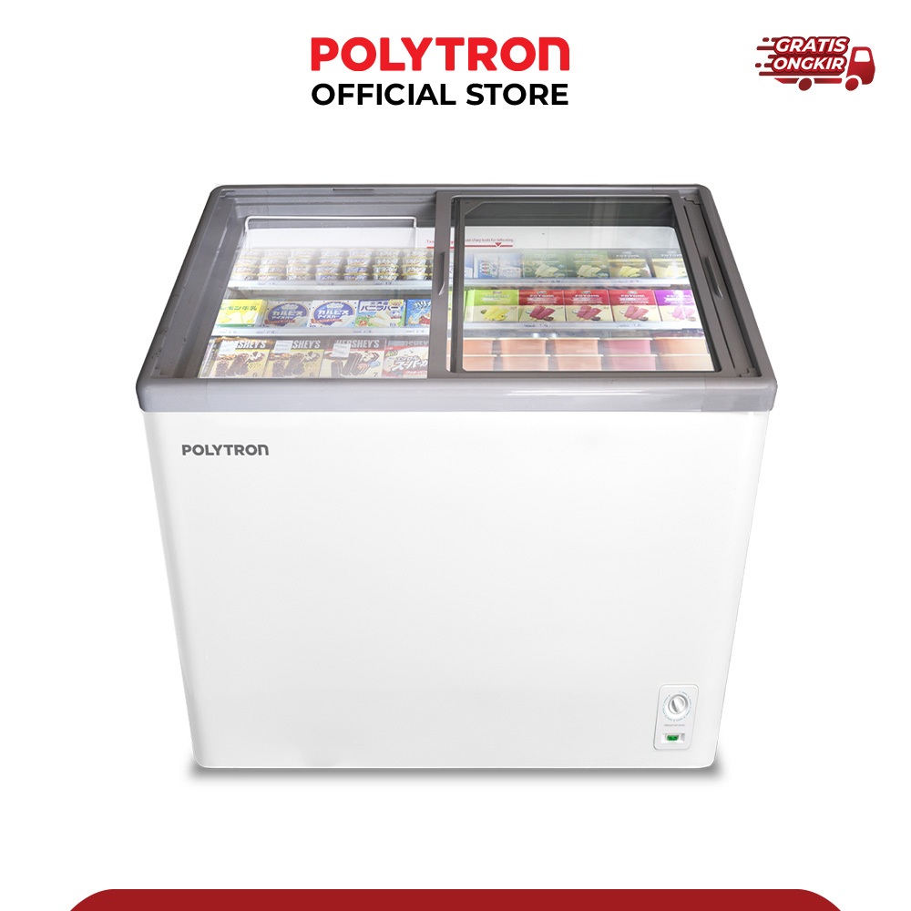 POLYTRON CHEST FREEZER SLIDING GLASS 200 LITER PCF 129 FREEZING BOX KULKAS ES BATU ICE CREAM 100L 200L LOW WATT ORIGINAL