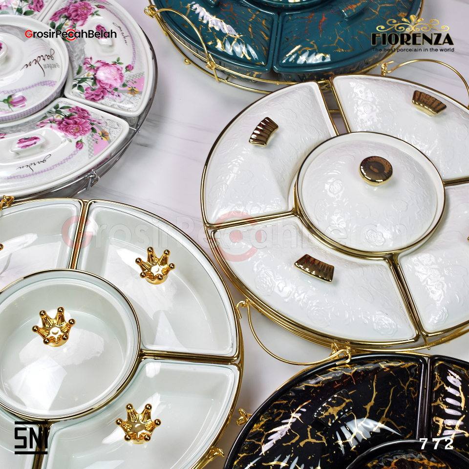 Fiorenza - Prasmanan Putar Keramik Set Wadah Saji Mewah Estetik | Motif Marble Linning Gold Bunga 772