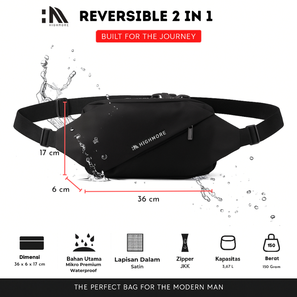 Waistbag Pria Waterproof HIGHMORE 2in1 Tas Selempang Pinggang Bisa Bolak Balik Crossbody Bag Stylish
