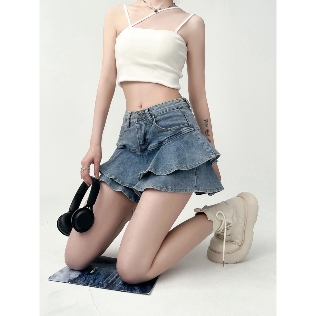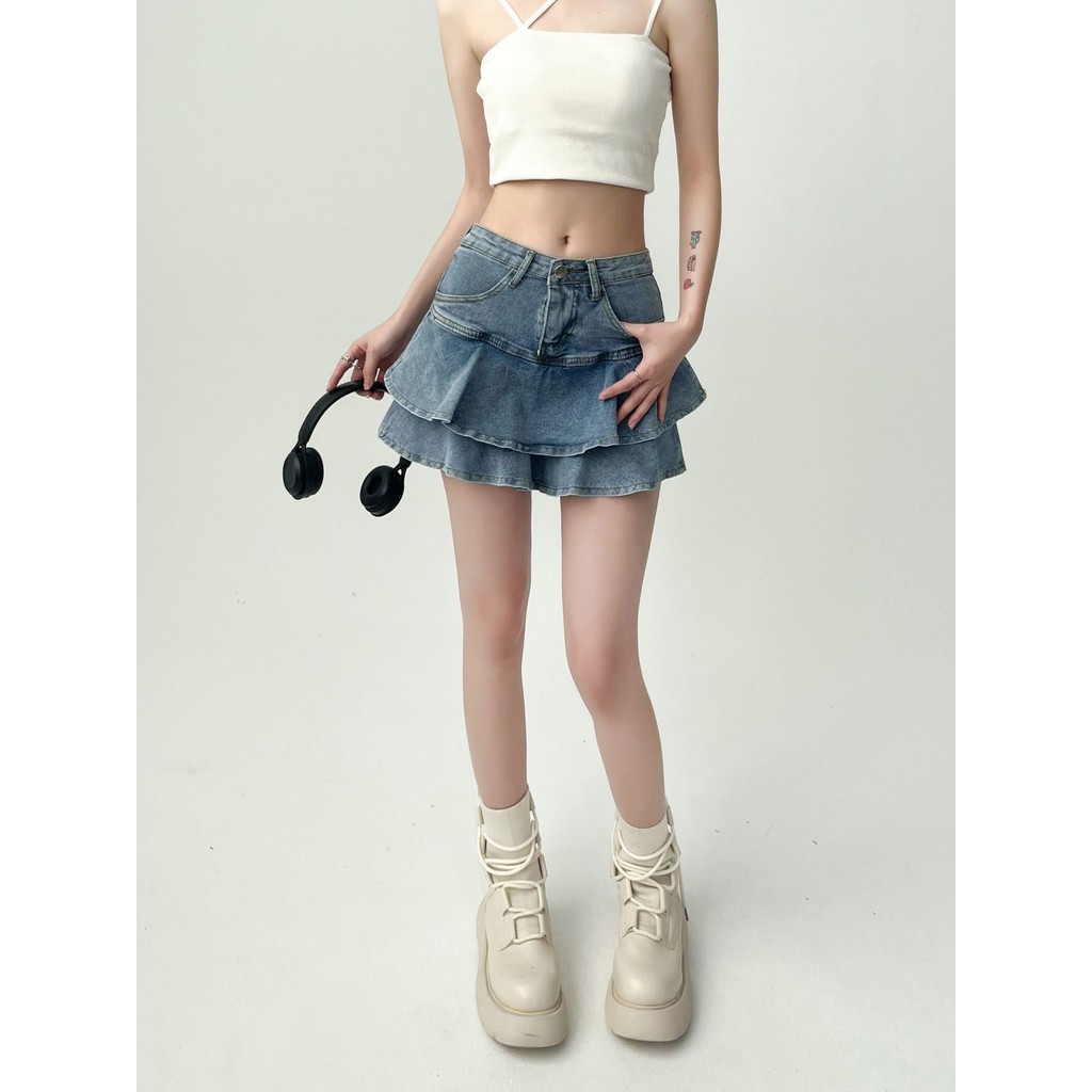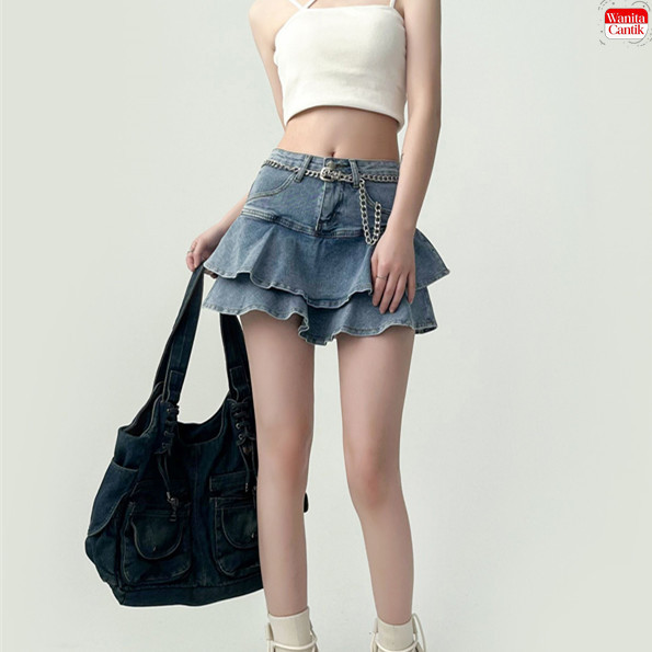 Rok Jeans Pendek Wanita High Waist Korean Style A-Line Seksi Rok Duyung Rok Bertingkat Denim Terbaru