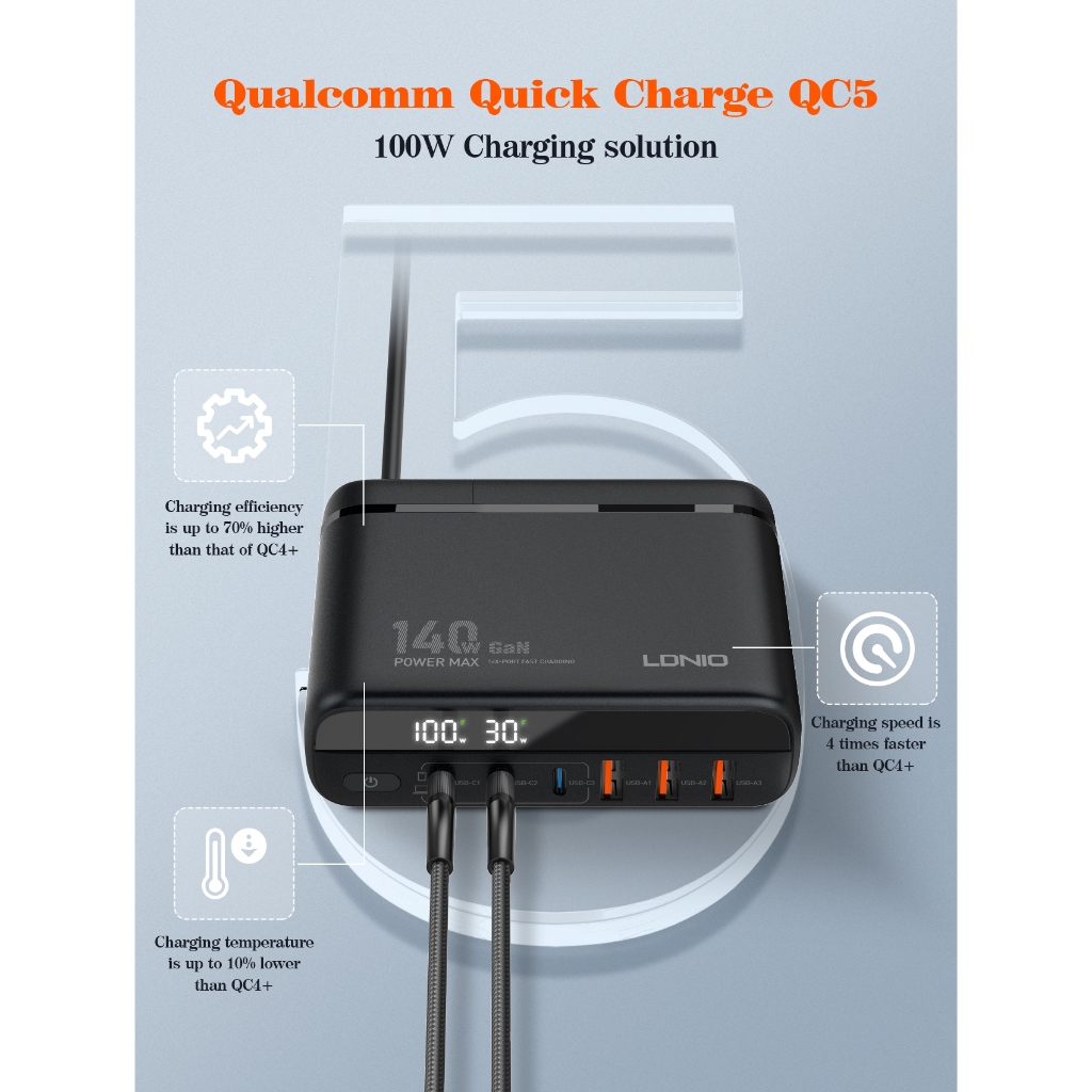 LDNIO Desktop Charger A6140C 140W GaN 6in1 USB C Port Multi Plug Changable Super Fast Charging