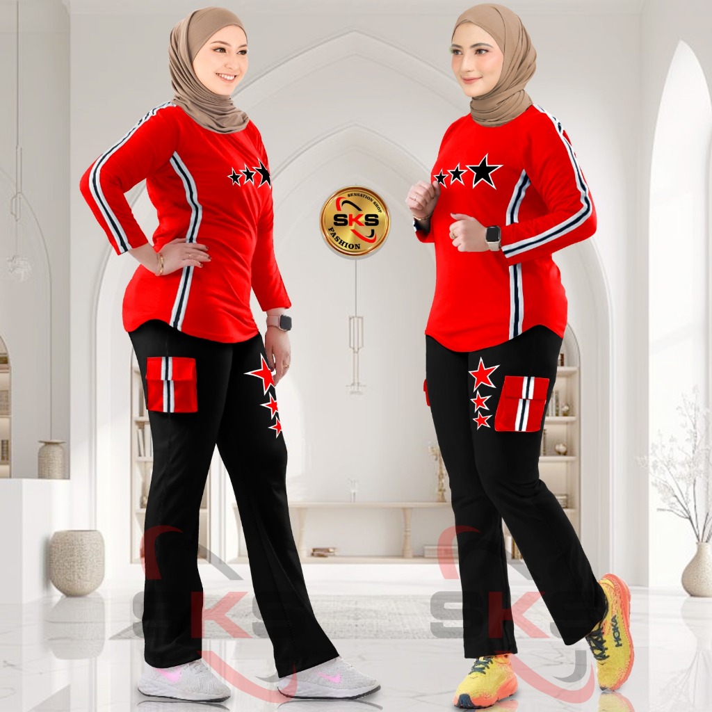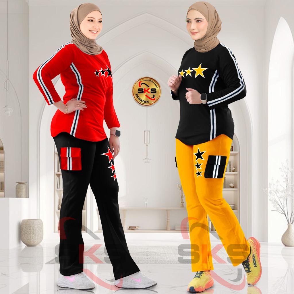 Setelan Olahraga Wanita Kombinasi Celana Cargo Sporty Motif Star Bintang Set Training Senam Oneset Joging Running Kekini