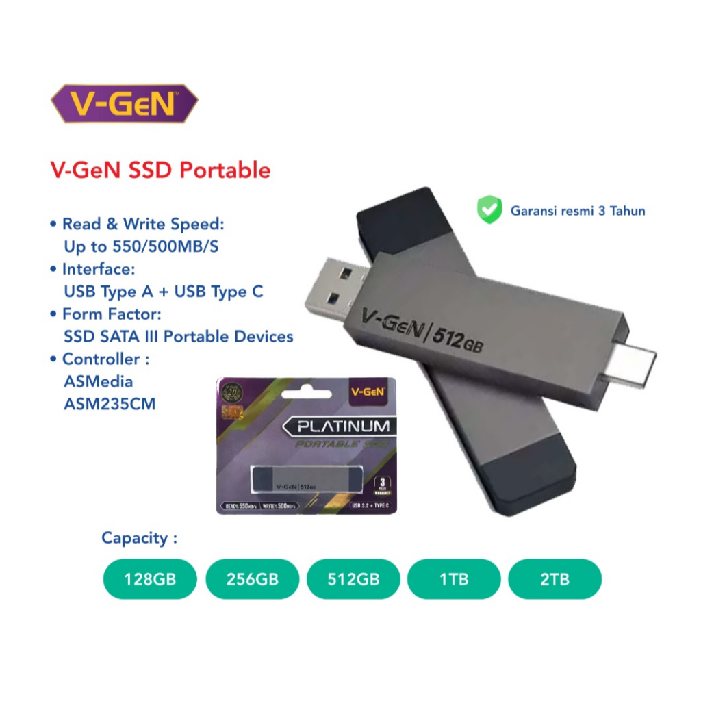 SSD Portabel VGeN Platinum 128gb, 256gb, 512gb, 1tb USB 3.2 TYPE C V-GeN SSD Portable Platinum