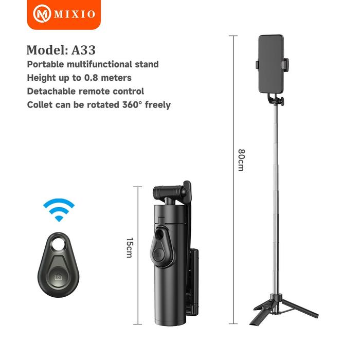 DIJAMIN ORI ! MIXIO A33 80CM TONGSIS BLUETOOTH SELFIE STICK TRIPOD SUPER MINI FOR SMARTPHONE LARIS