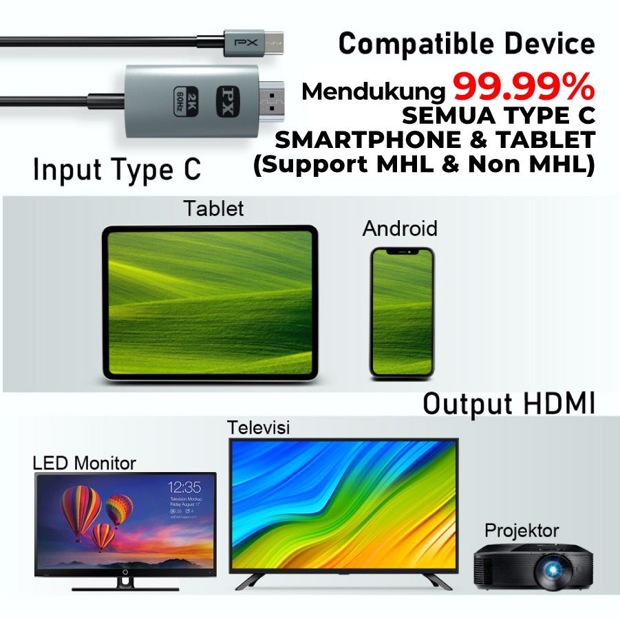 Kabel MHL USB Type C to HDMI TV Proyektor Converter 2M PX MHA-30C