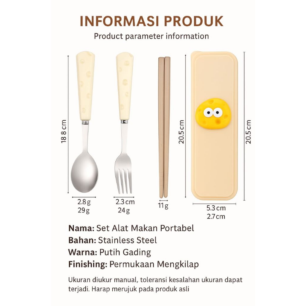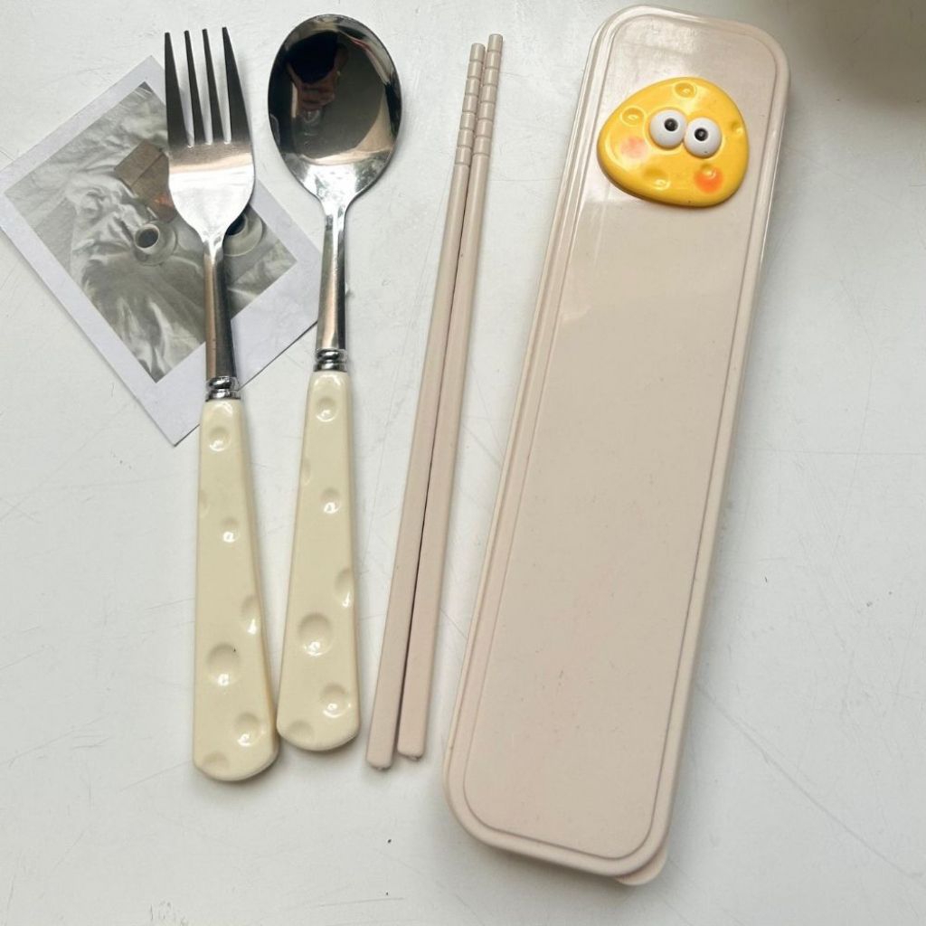 Set Alat Makan Lucu Motif Keju 3in1 – Sendok, Garpu, Sumpit + Kotak Penyimpanan Karakter Imut