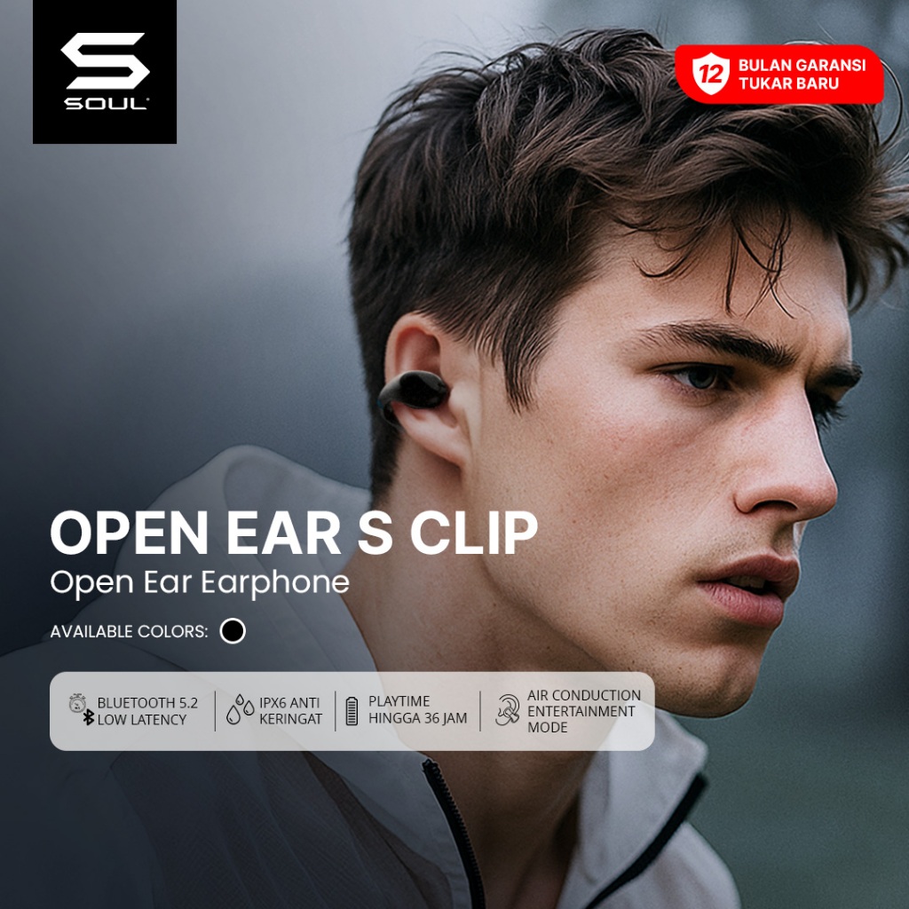 SOUL S Clip Open Ear Earphone OWS Clip IPX6 Lightweight Bluetooth Low Latency Anti Keringat