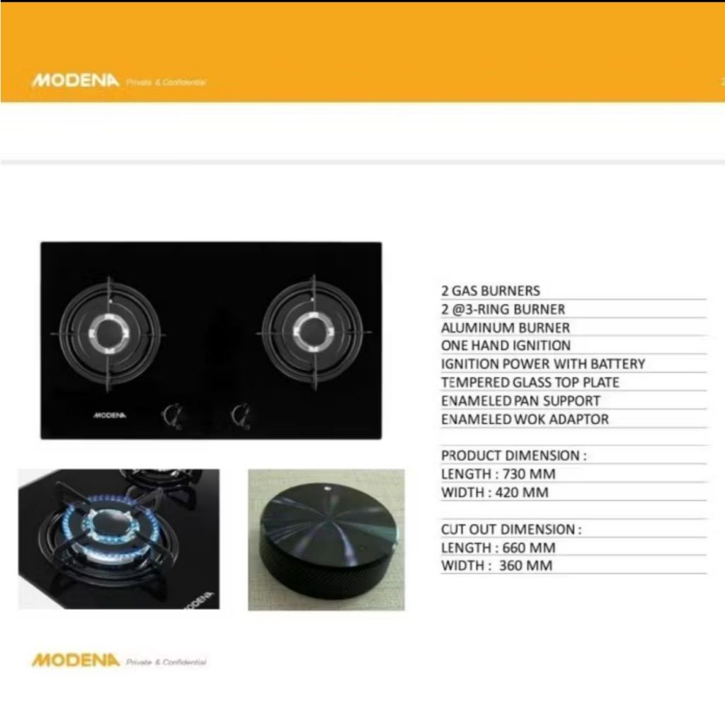 MODENA KOMPOR TANAM GAS 2 TUNGKU KACA BH 0725 ADBK BH0725 ADBK TEMPERRED GLASS /BUILT IN HOB MODENA 2 TUNGKU BH0725ADBK