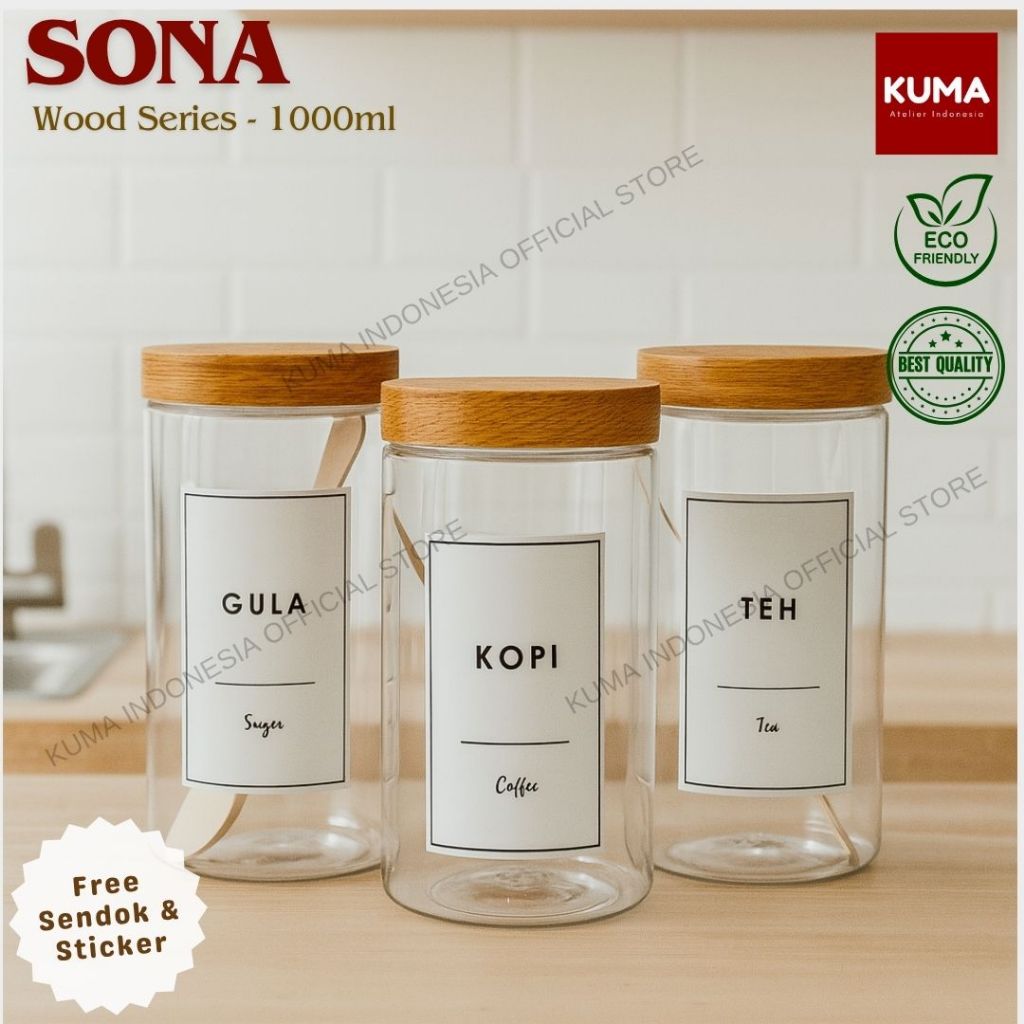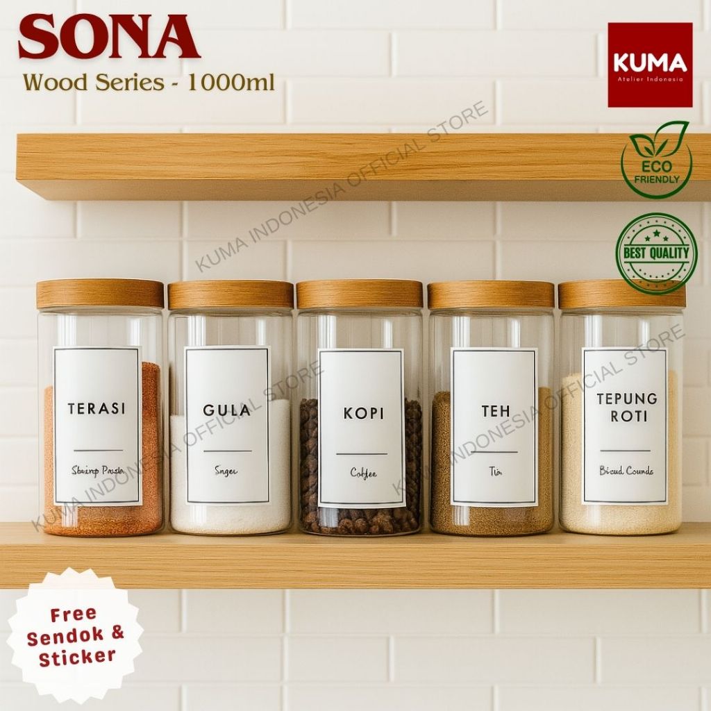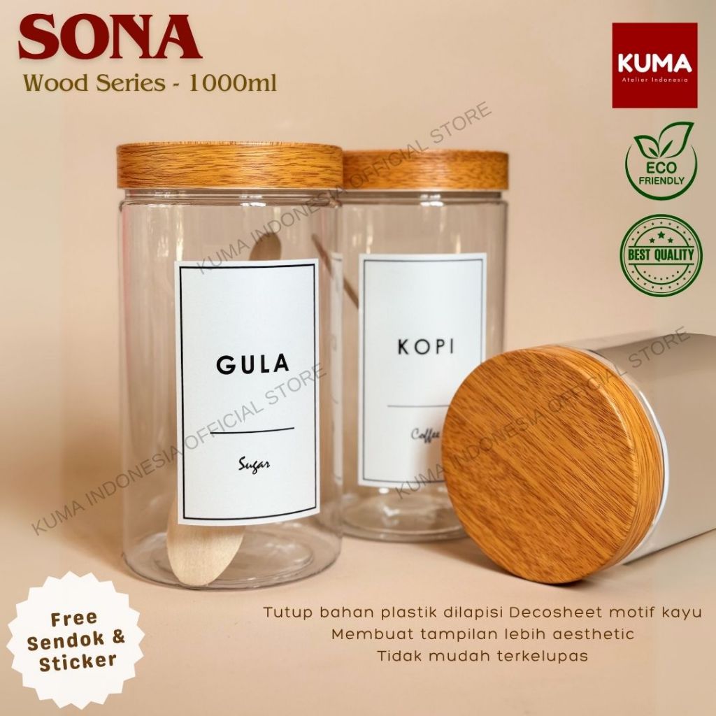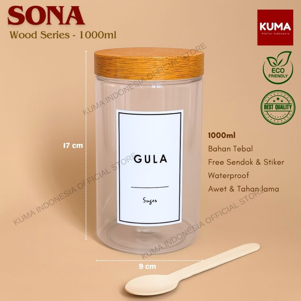 Toples Bumbu Kuma Sona Wood Series 1000Ml Plastik Free Sendok Stiker Waterproof Food Grade