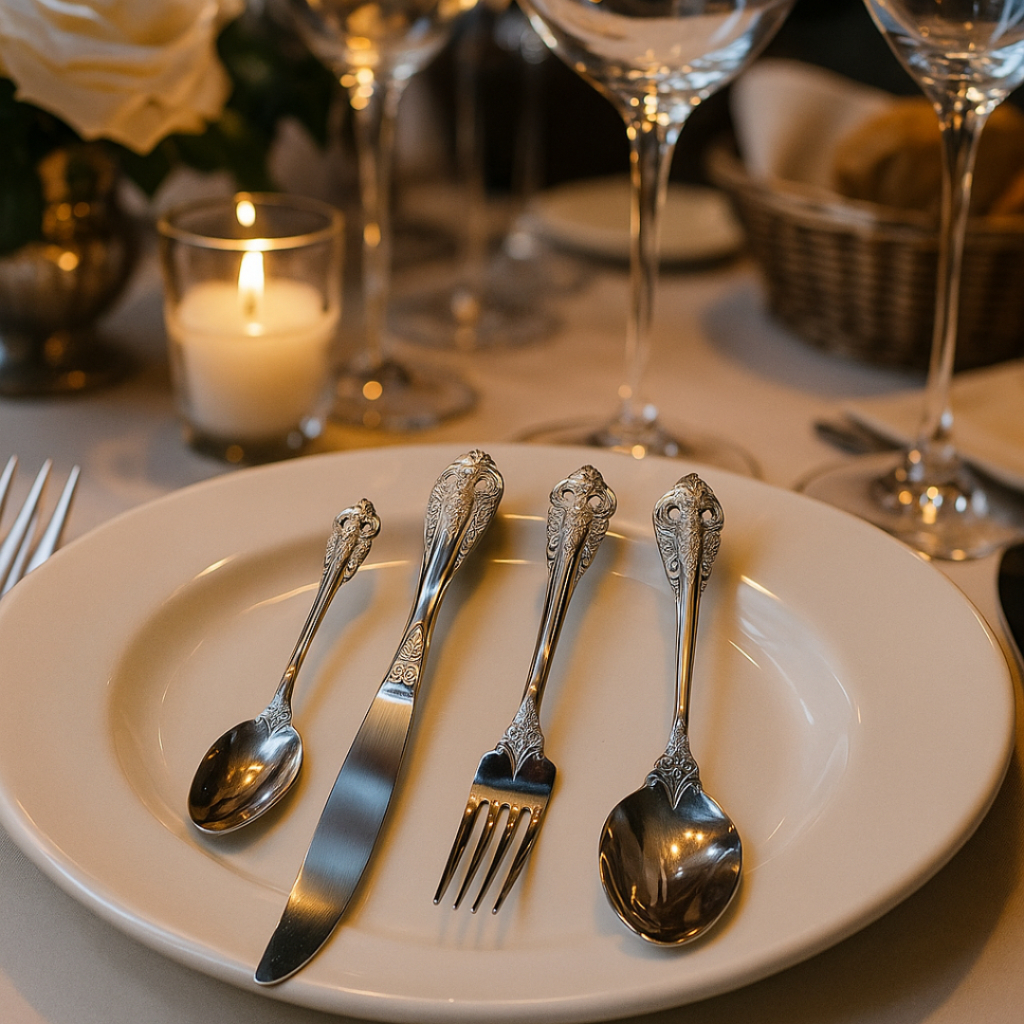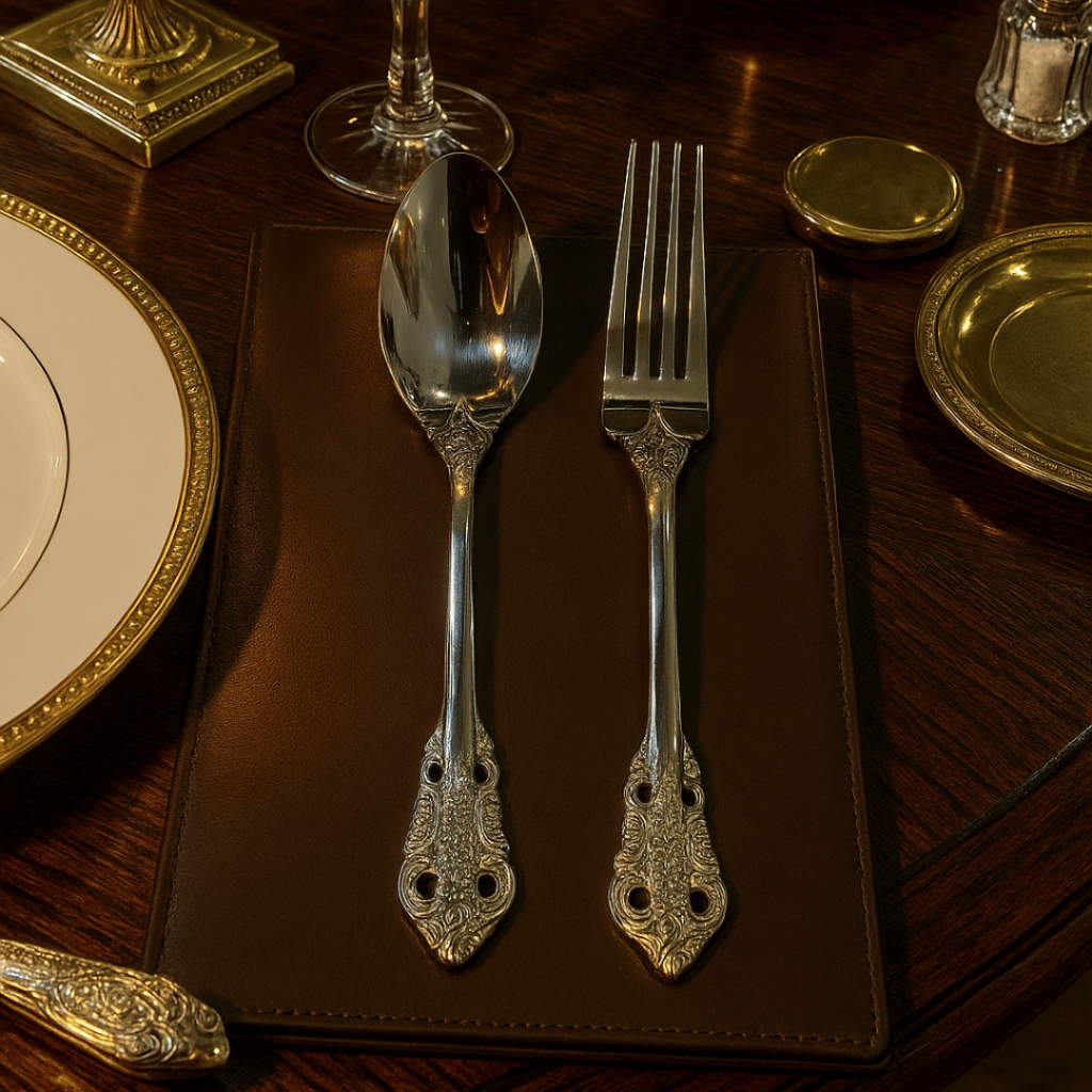 Set Alat Makan kuningan mengkilap Silver Stainless Steel dengan Motif Klasik untuk Acara Formal dan Dekorasi Meja