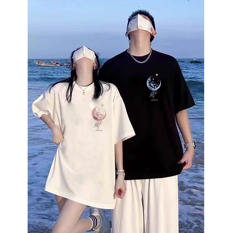 Mode Korea paus lumba-lumba bulan astronot planet baju kaos pria T-shirt wanita t shirt pria couple pasangan oversize co