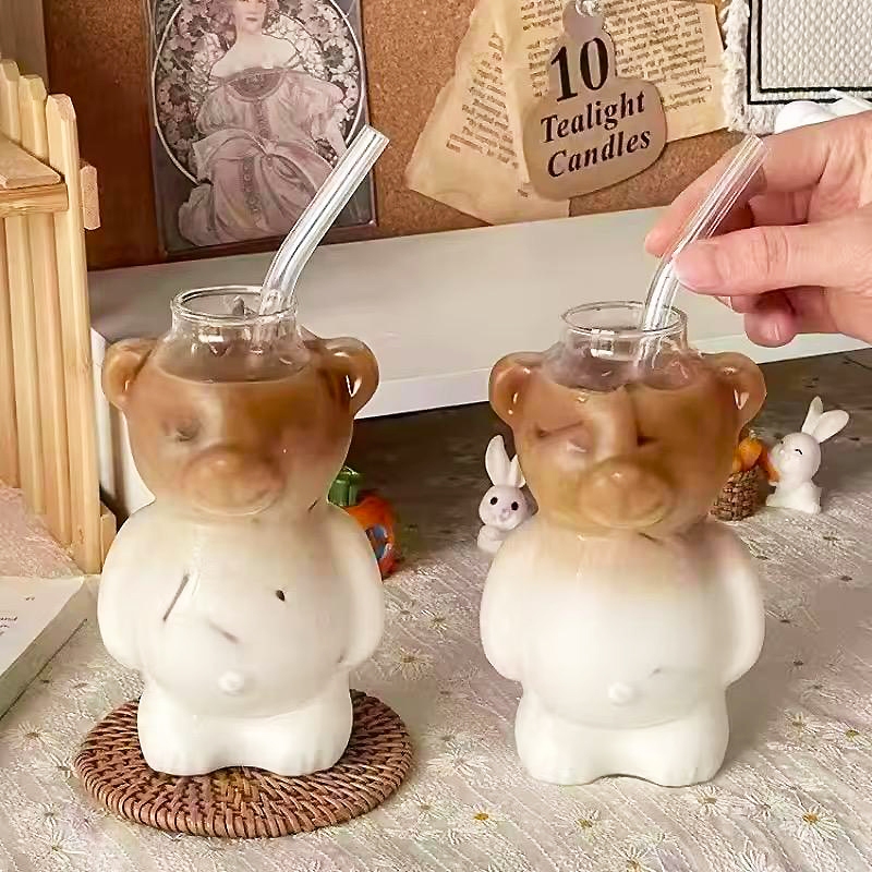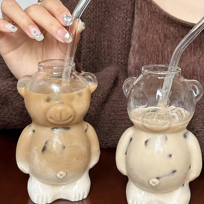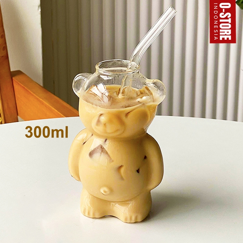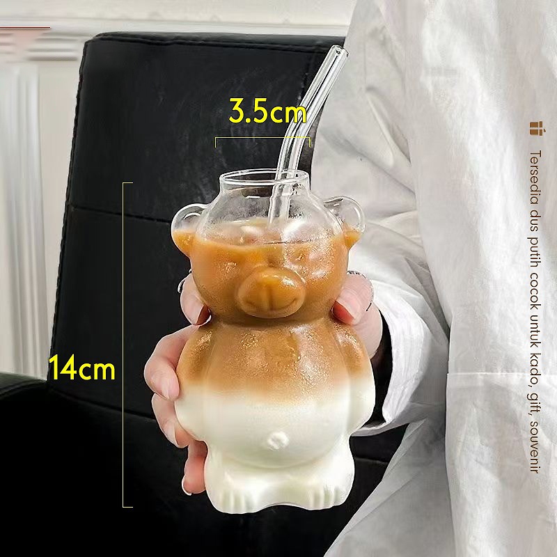 Gelas Matcha Aesthetic Kaca Sedotan Karakter Beruang Cangkir Tumbler Labuba