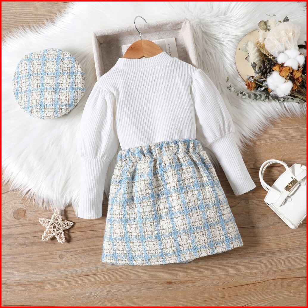 Kidsfo-105 Free Topi Setelan Set Anak Cewek Baju Kaos Katun Rok Tweed Free Topi Gemas