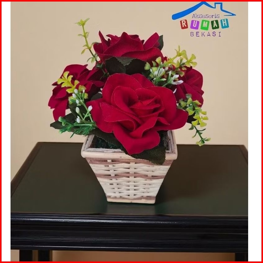 Buket Bunga Mawar Beludru Mekar Dengan Vas Rotan Bambu Piramid