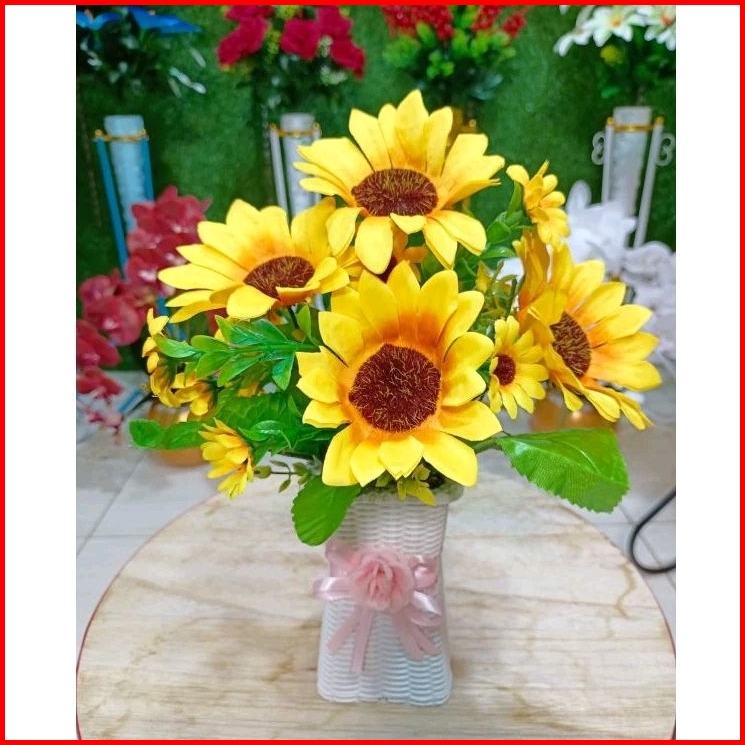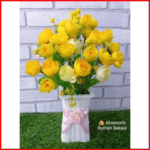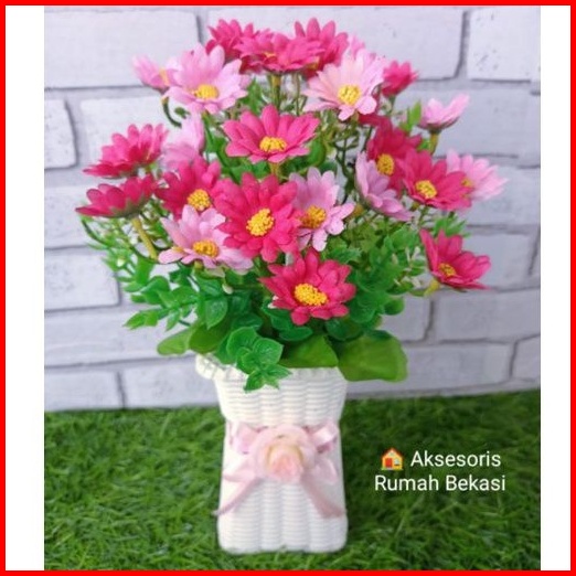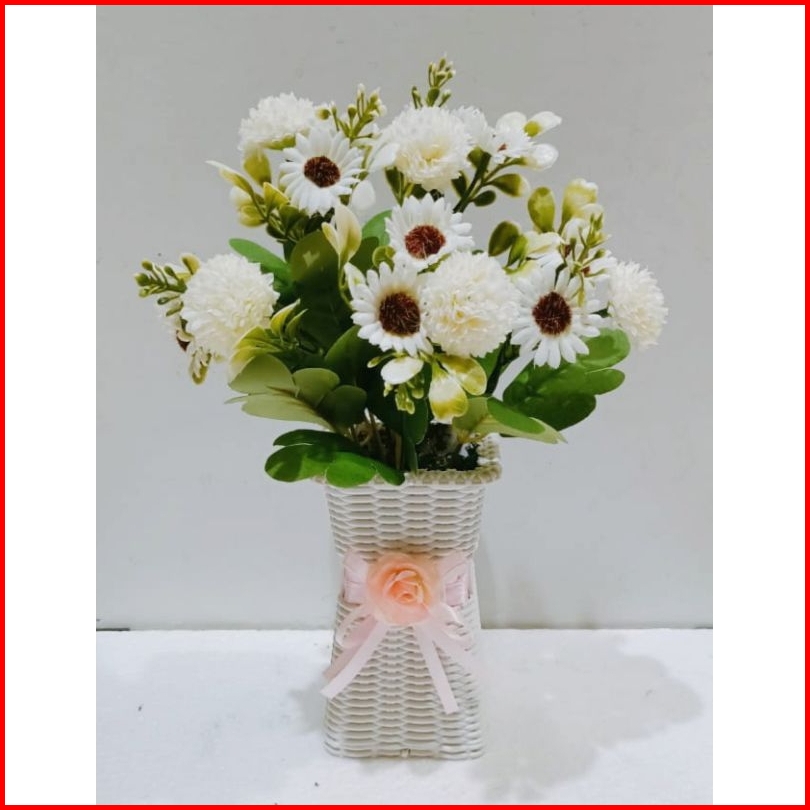 Set Rangkaian Aneka Buket Bunga Artificial Dengan Pot Rotan Plastik