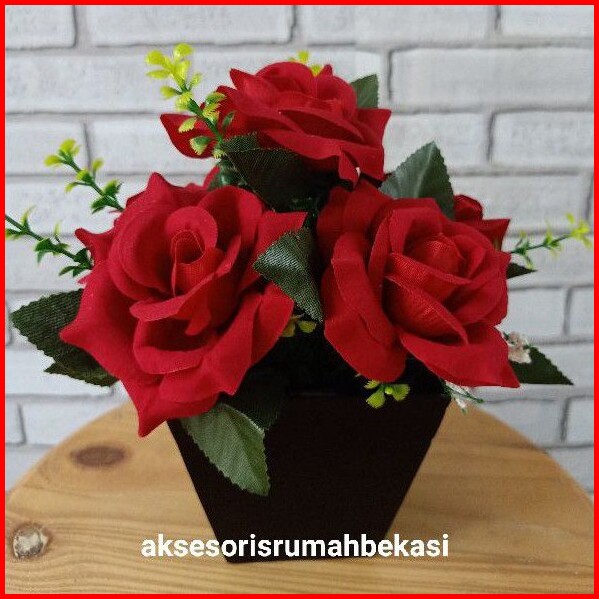 Buket Mawar Beludru Artificial Buket Mawar Plastik Dengan Vas Kayu Hitam