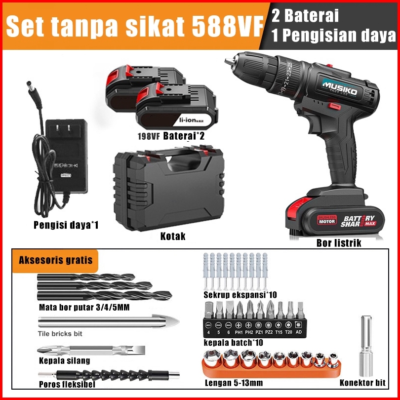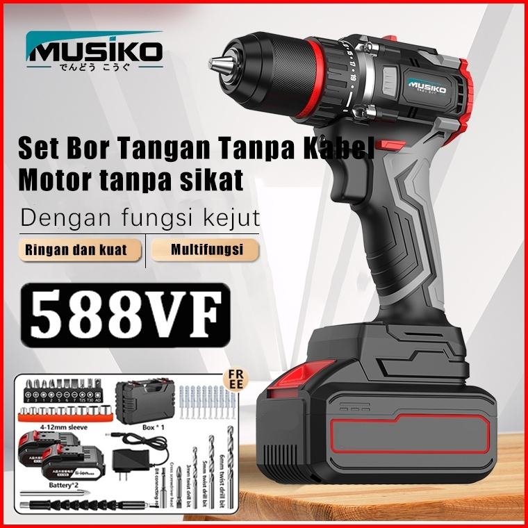 Musiko 588vf Bor Tangan Nirkabel 2 Baterai - Bor Besi Tembok Beton Kayu 10mm - Gratis Ongkir Garansi 1 Tahun