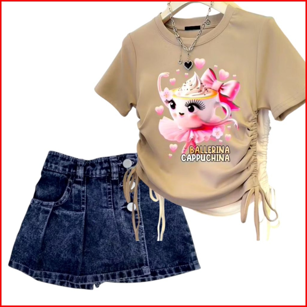 Setelan Anak Perempuan Rok Jins Atasan Kaos Gambar Ballerino Capuchina 1-7 Tahun S