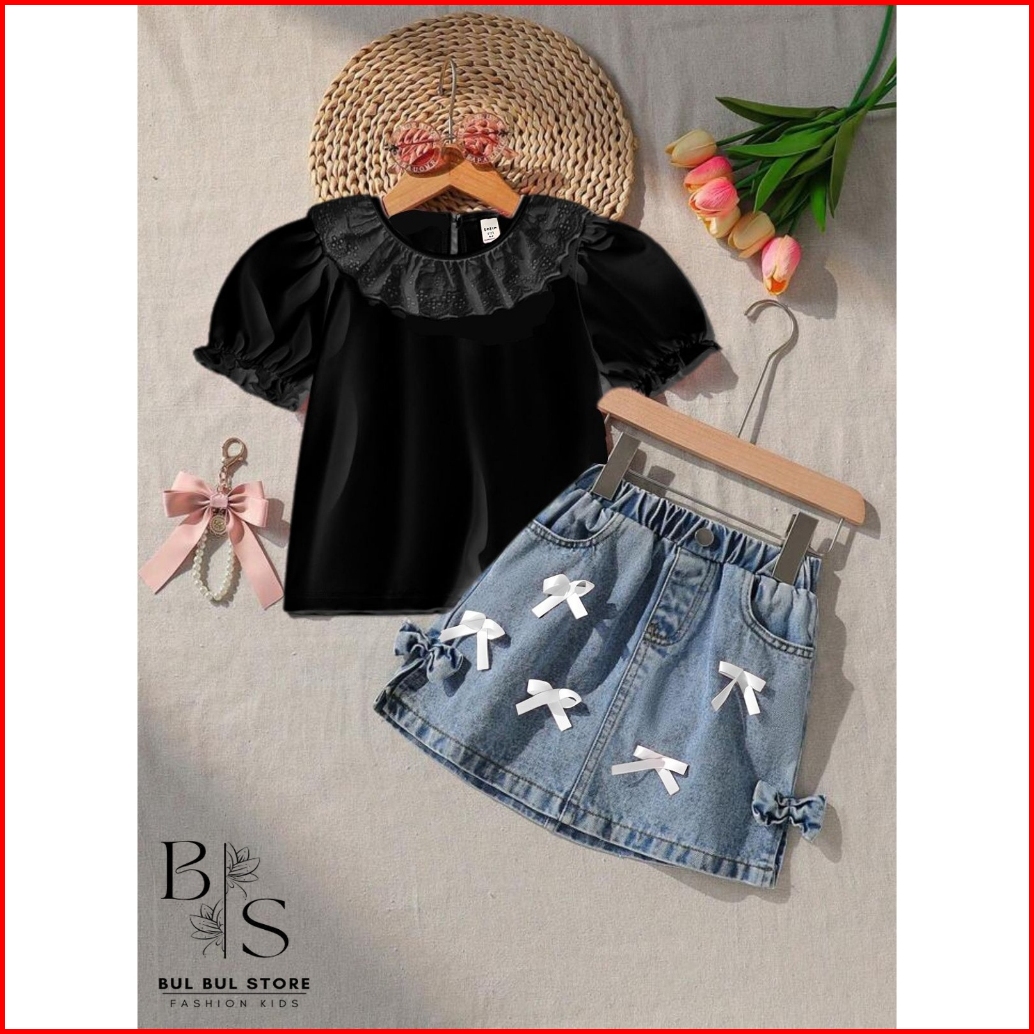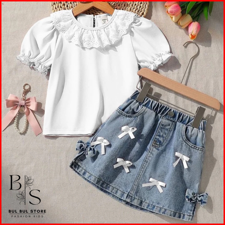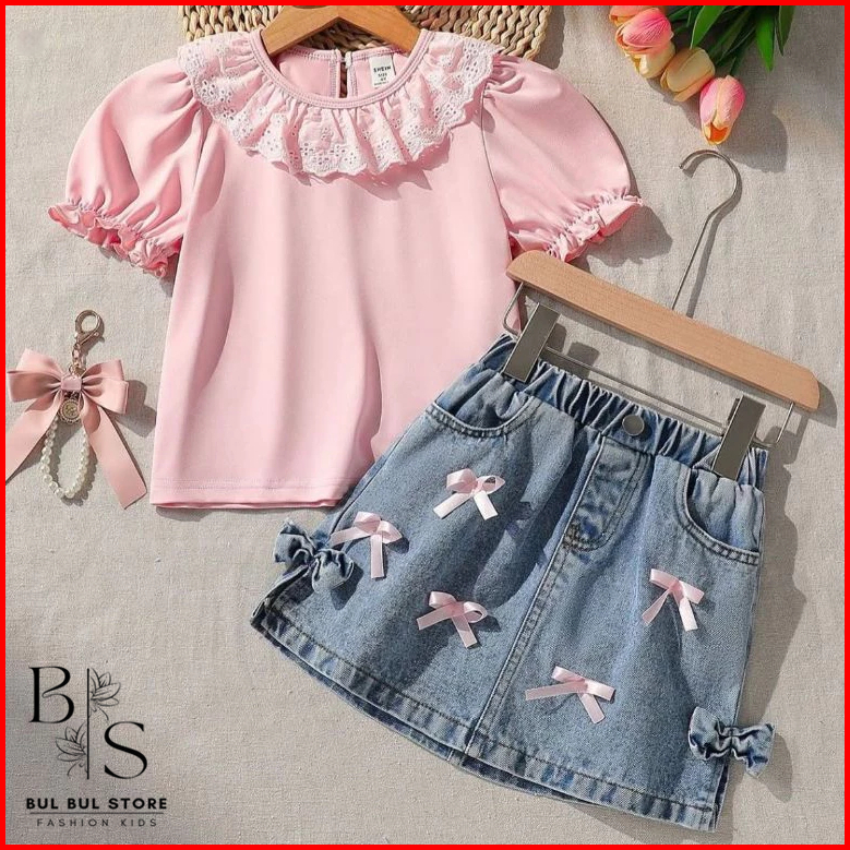 Setelan Anak Perempuan 1-5 Tahun Oneset Rok Jeans Anak Baju Anak Cewek Setelan Denim Anak Pita Renda By.bulbulstore