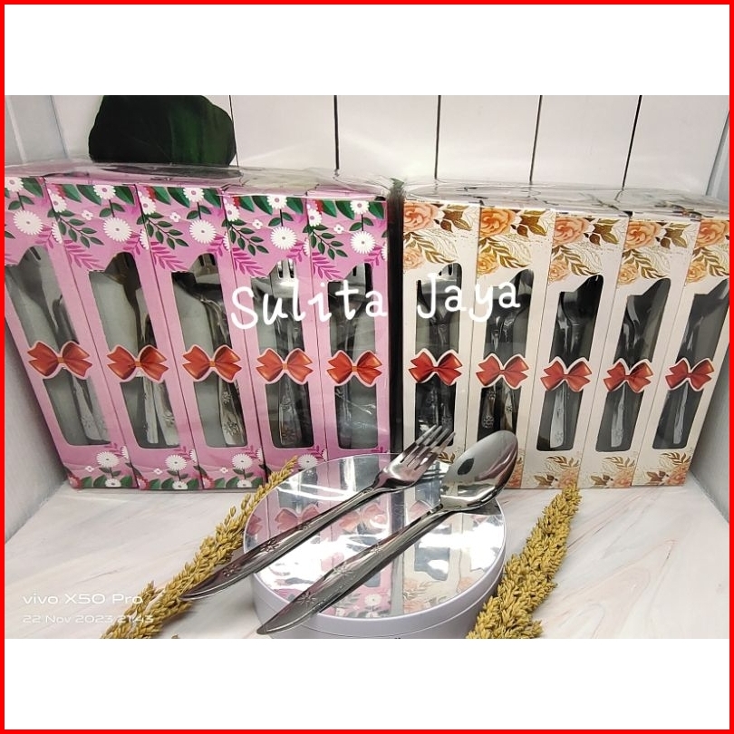 Is 50 Pcs Souvenir Pernikahan Sendok Garpu Stenlis Kemas Box Motif
