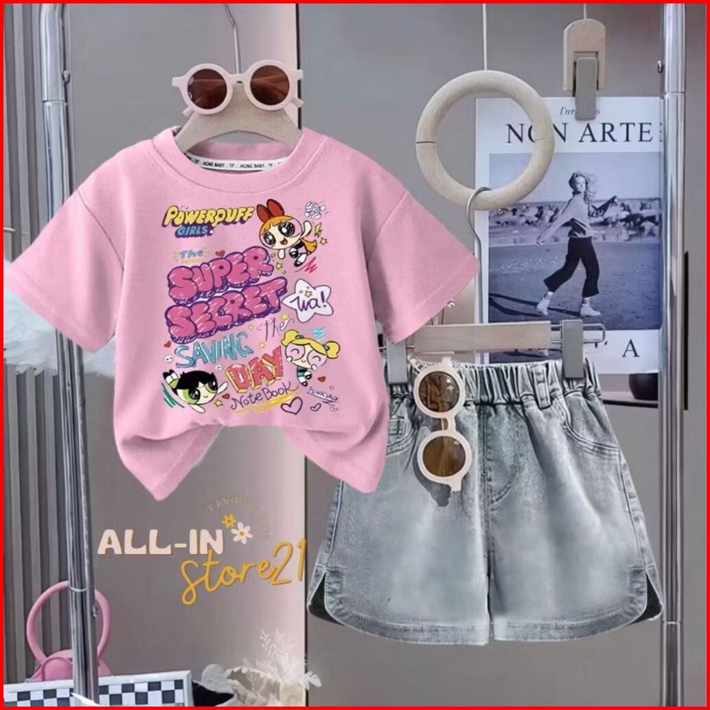 Setelan Anak Perempuan Motif Earphone Baju Lengan Pendek Dan Celan Denim Pendek Terbaru 1-5 Tahun