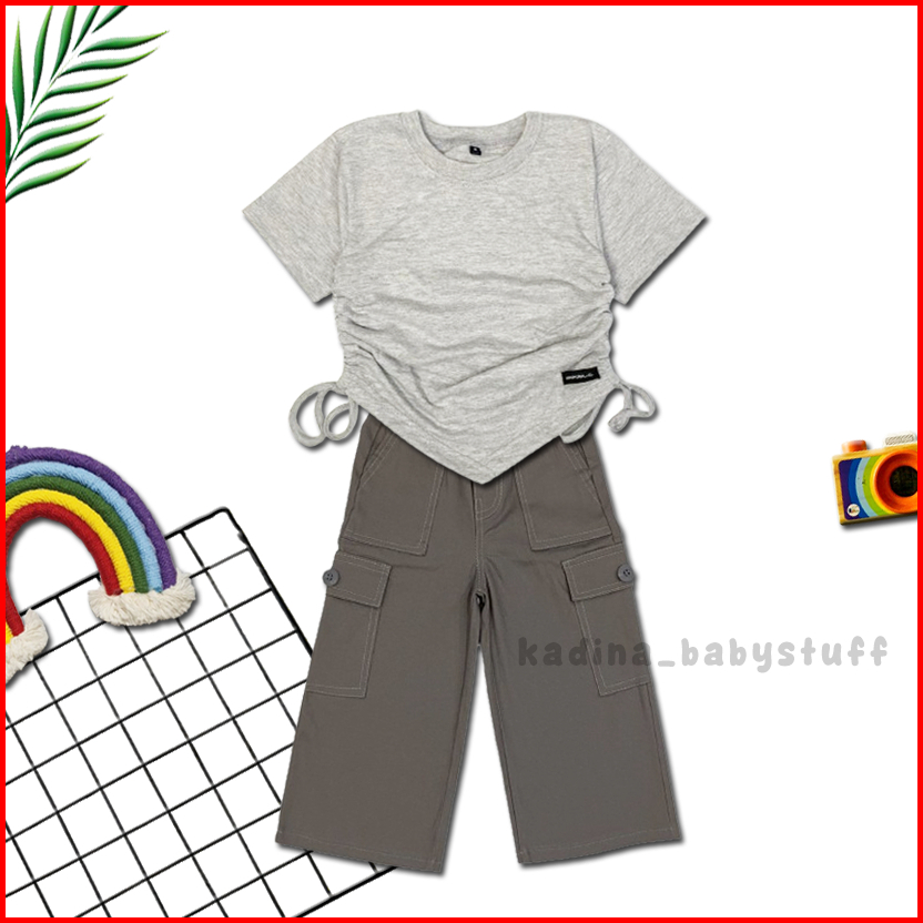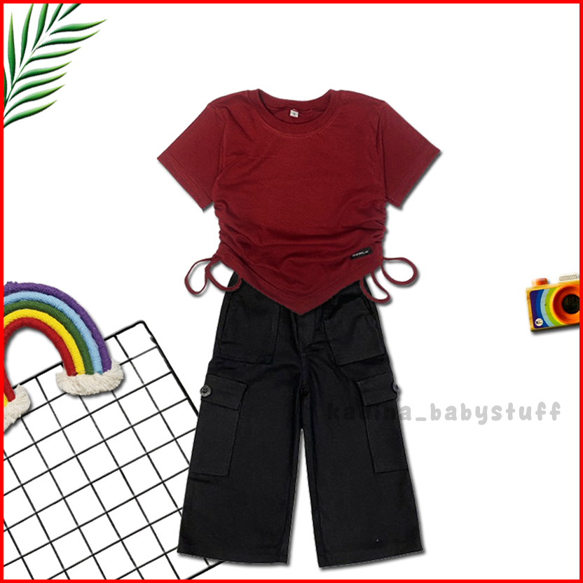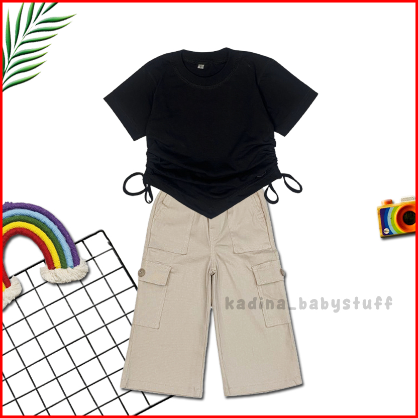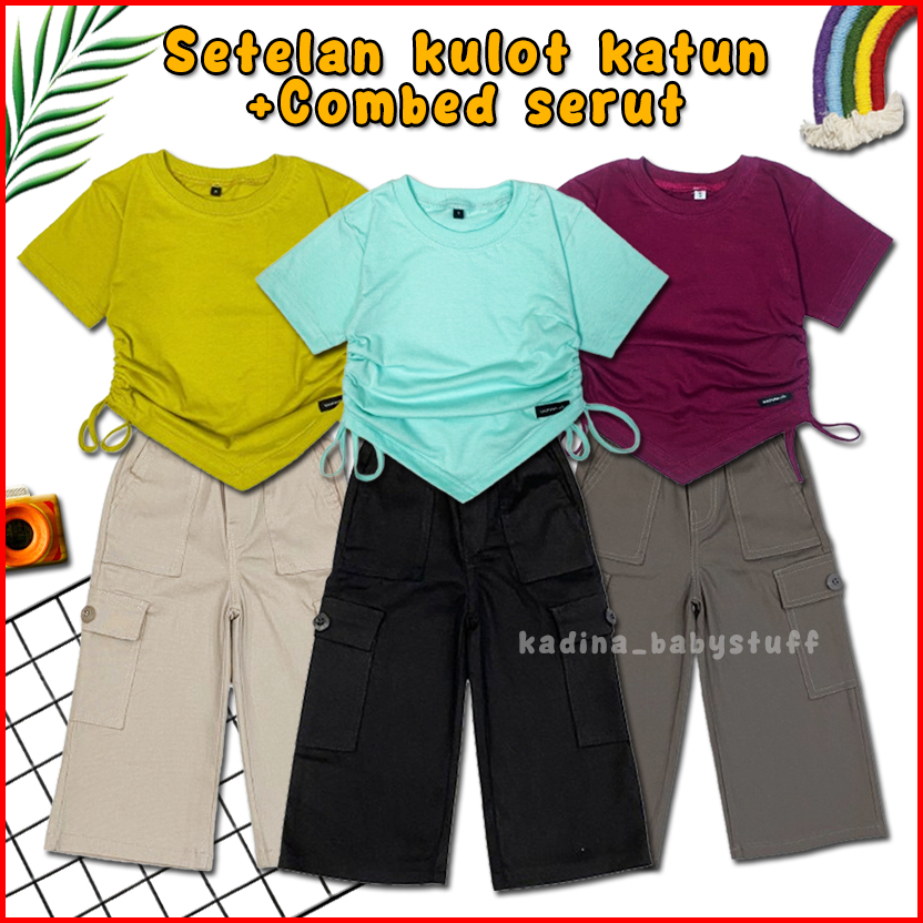 Setelan Anak Perempuan Kekinian Terbaru Kulot Katun Cargo Import Combed Serut Polos Usia Anak 2-12 Tahun