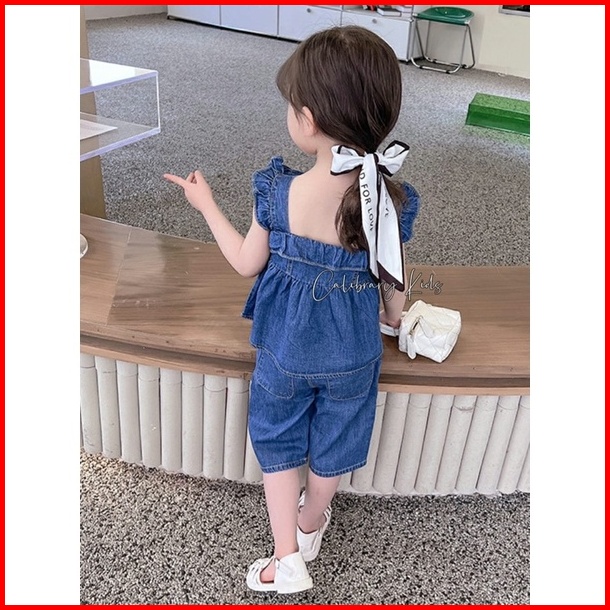 Setelan Denim Anak Bahu Ruffle - Setelan Anak Perempuan - Pakaian Anak Perempuan