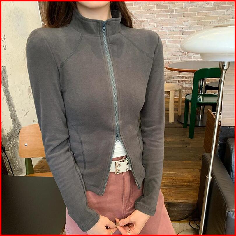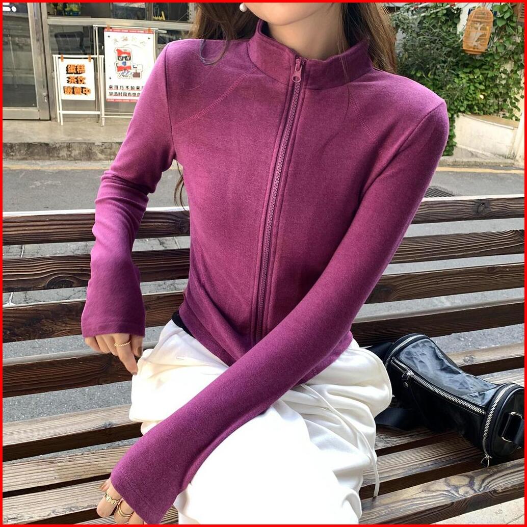 Jaket Kardigan Crop Ramping Kerah Berdiri Ritsleting Ganda Ungu Wanita Kekinian