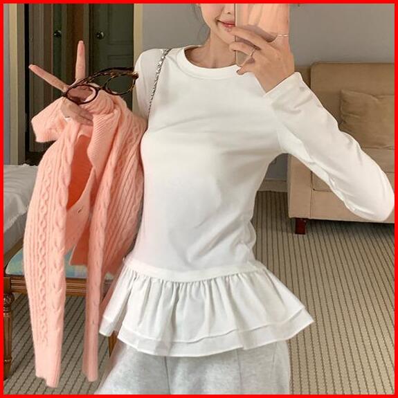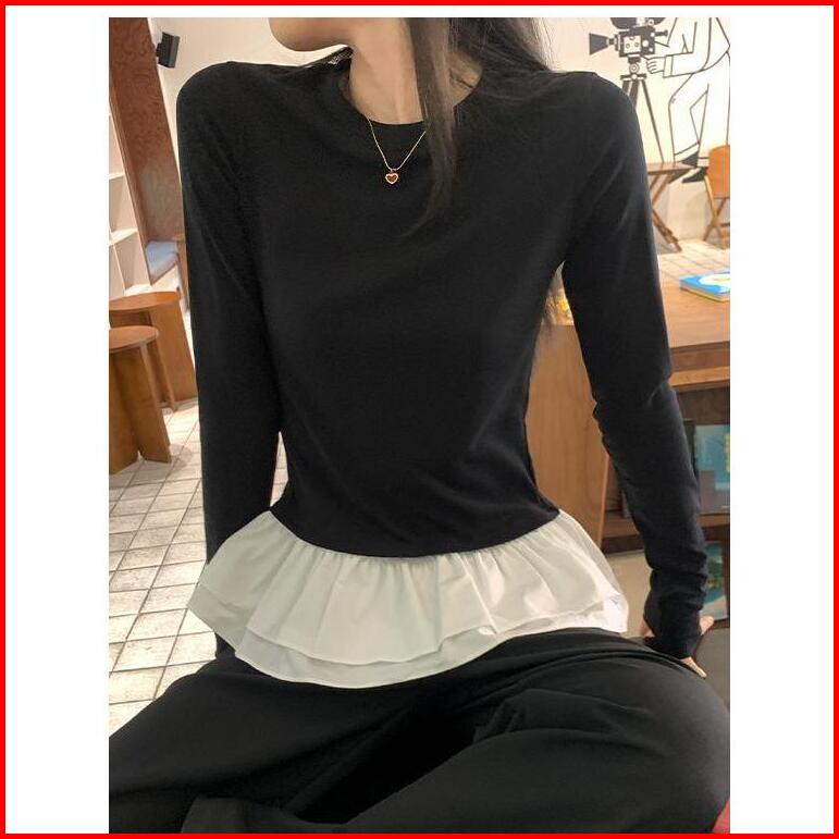 Kaos Lengan Panjang Tambal Sulam Tepi Daun Teratai Hitam Gaya Balet