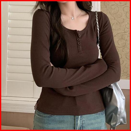 Kaos Lengan Panjang Kerah Setengah Terbuka Dengan Kancing Hitam - Crop Top Polos