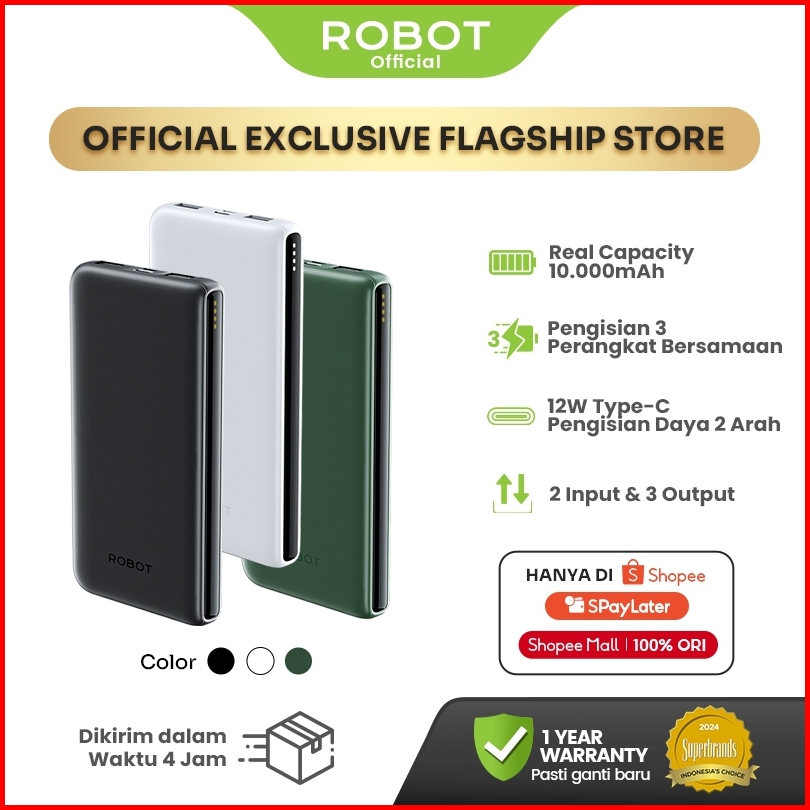 Robot Powerbank 10000mah 3 Output Dual Input Type-c Power Bank Rt180s Fast Charging 12w Android Iphone - Garansi 1 Tahun