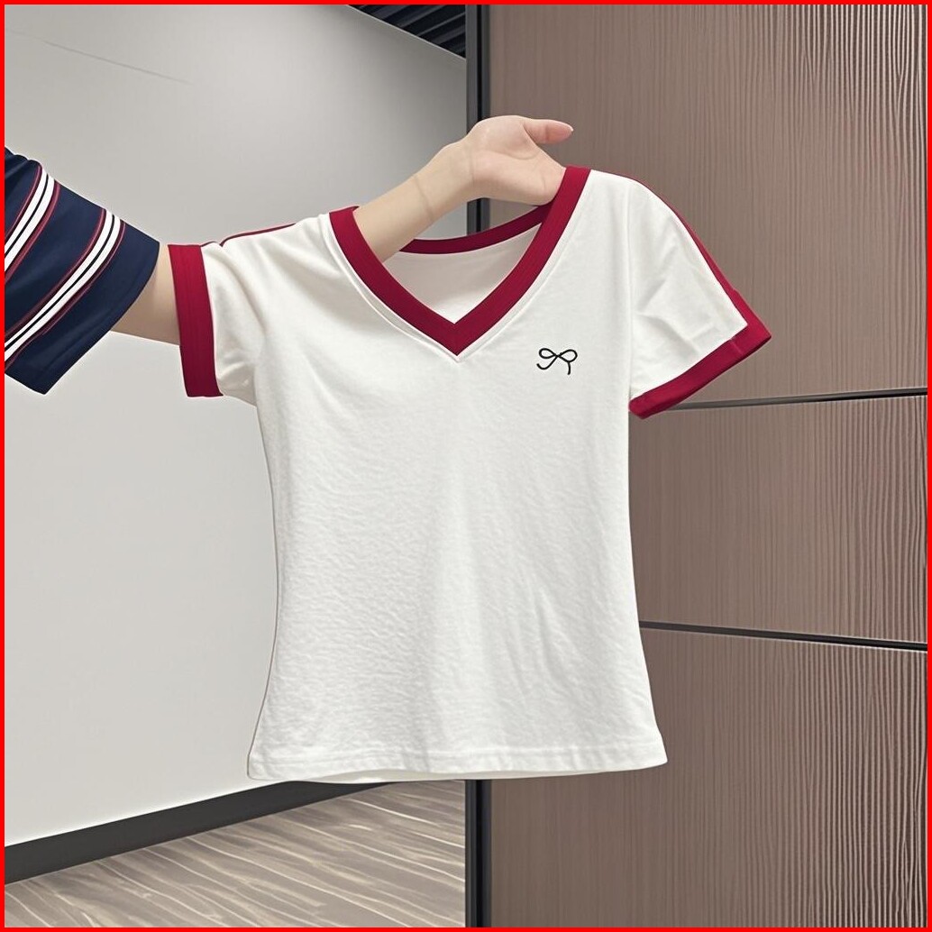 T-shirt Lengan Pendek Kontras Garis-garis V-neck Merah Crop Top Sulaman Busur Wanita