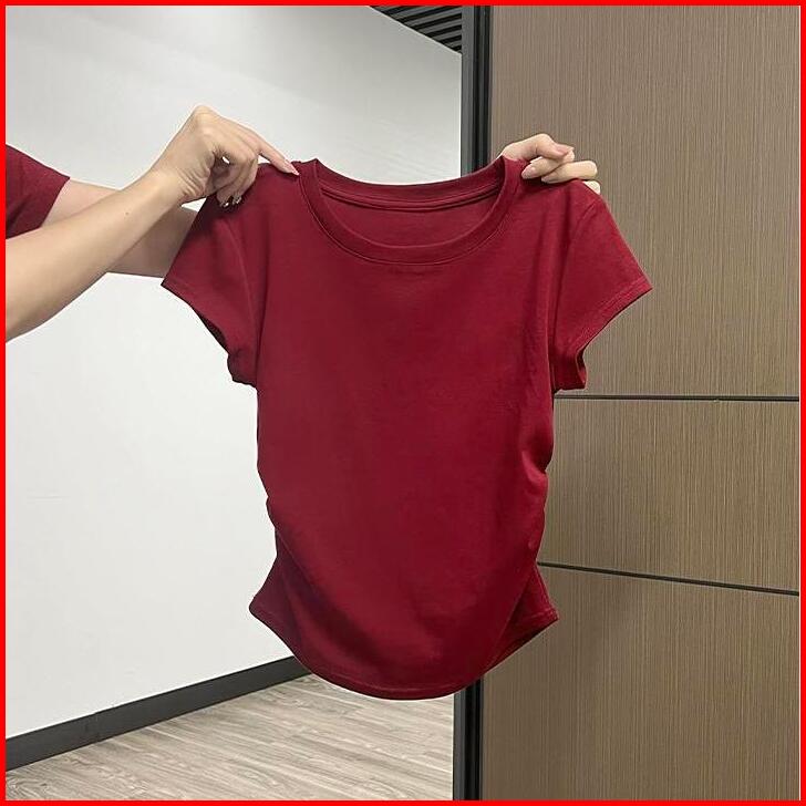 T-shirt Basic Lipit Samping Leher Kru Merah Atasan Kaos Polos Import Wanita